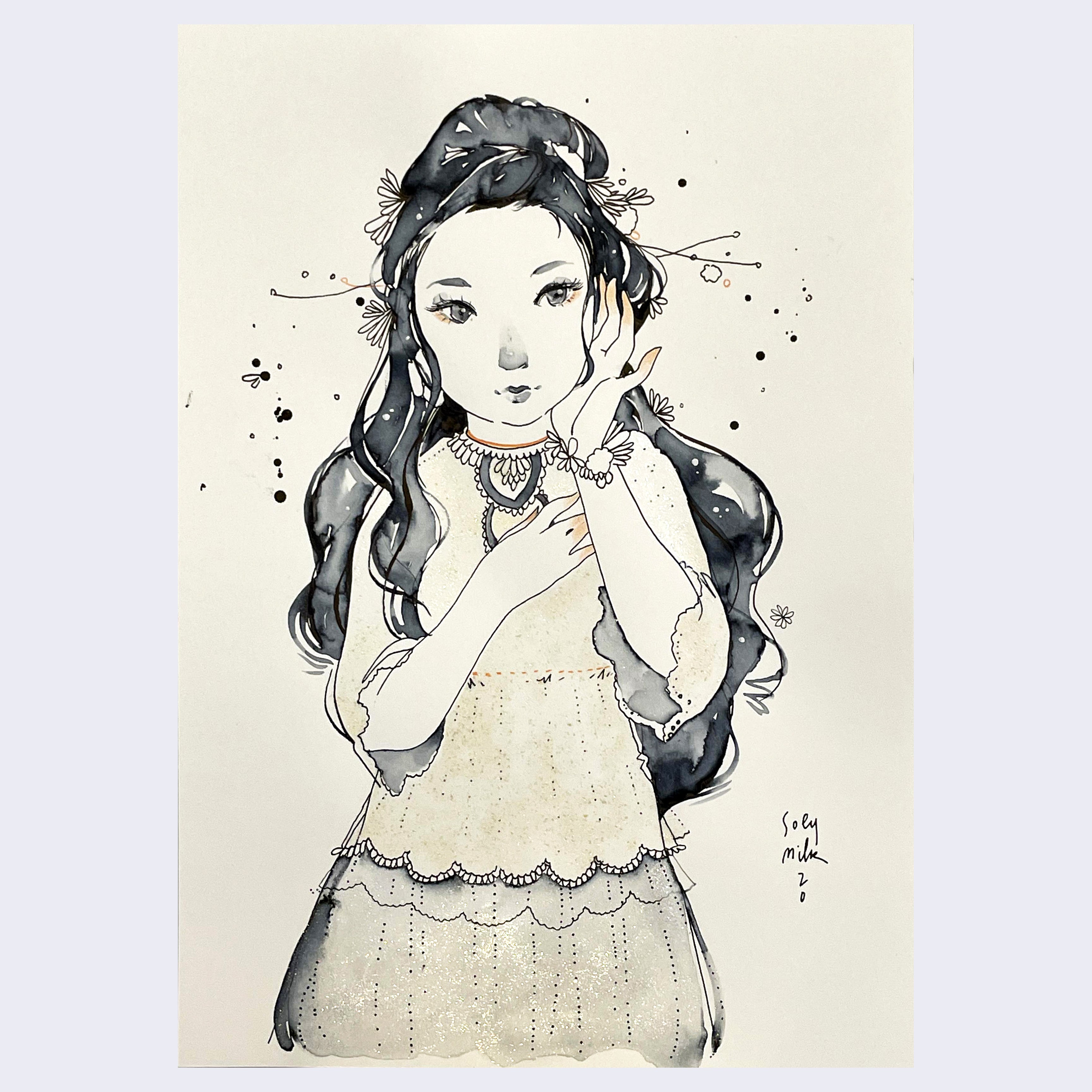 Ink, colored pencil and Glittered Enamel on paper.