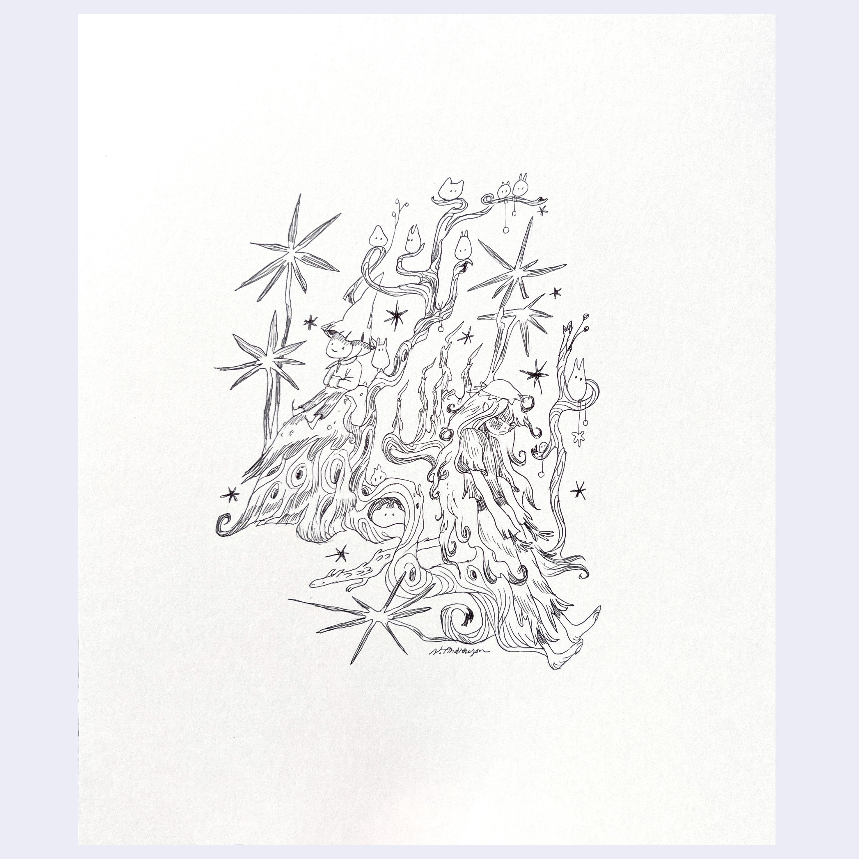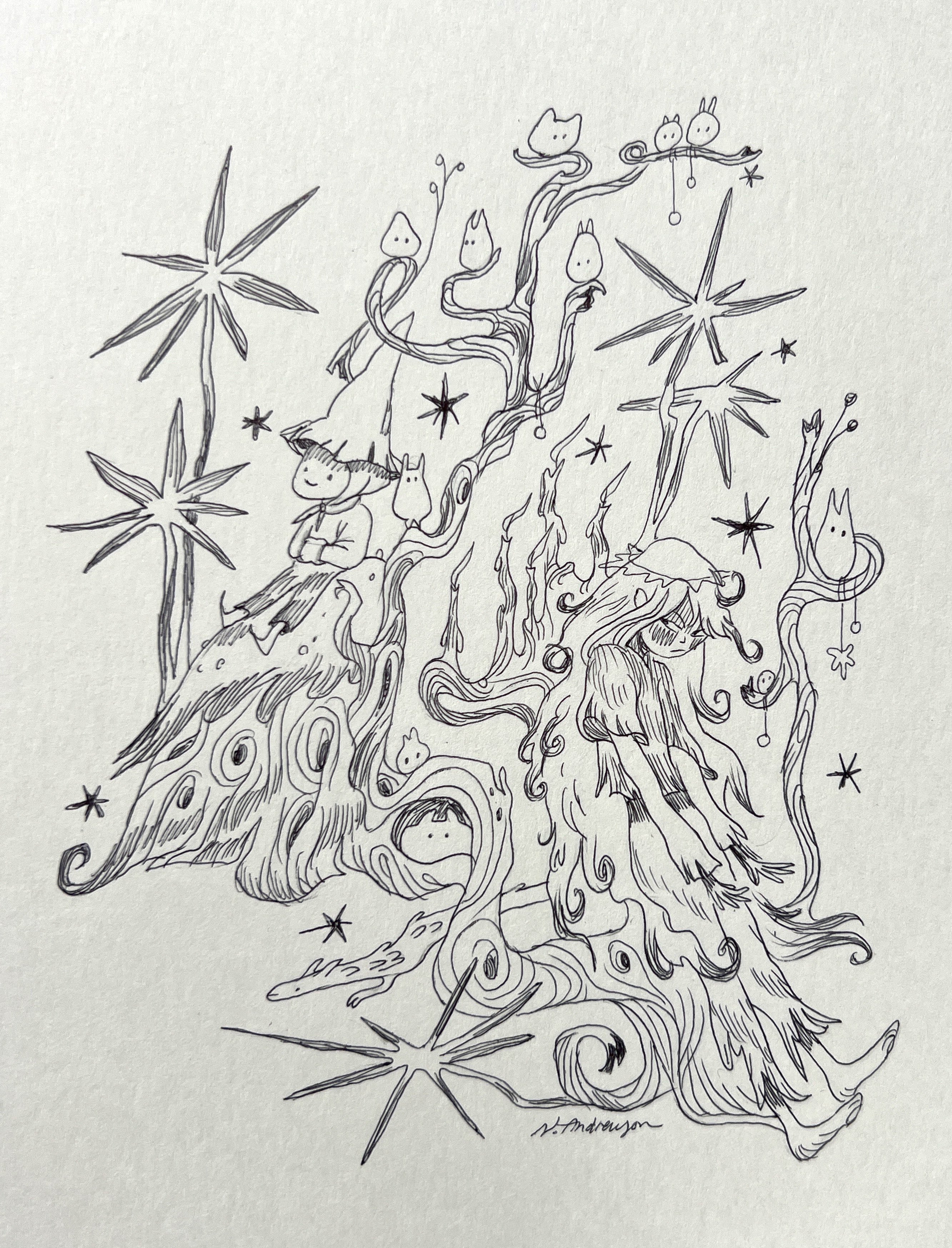 Pencil sketch of a girl leaning up against wild tree branches, with small creatures sitting on them. A happy elf creature sits in the background.