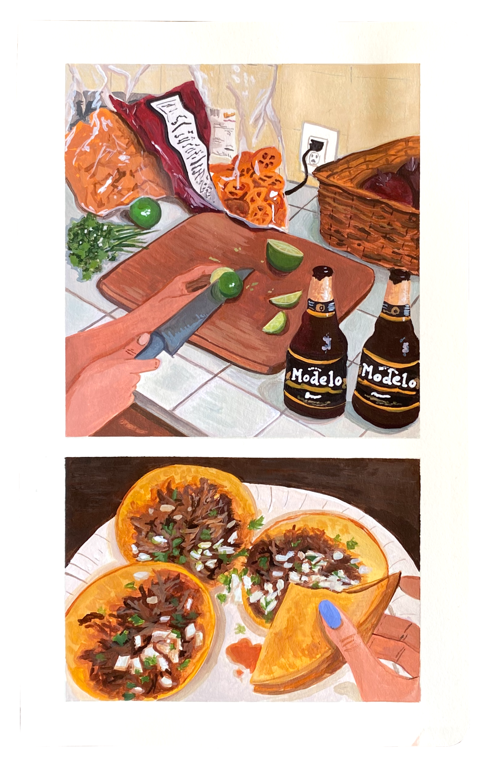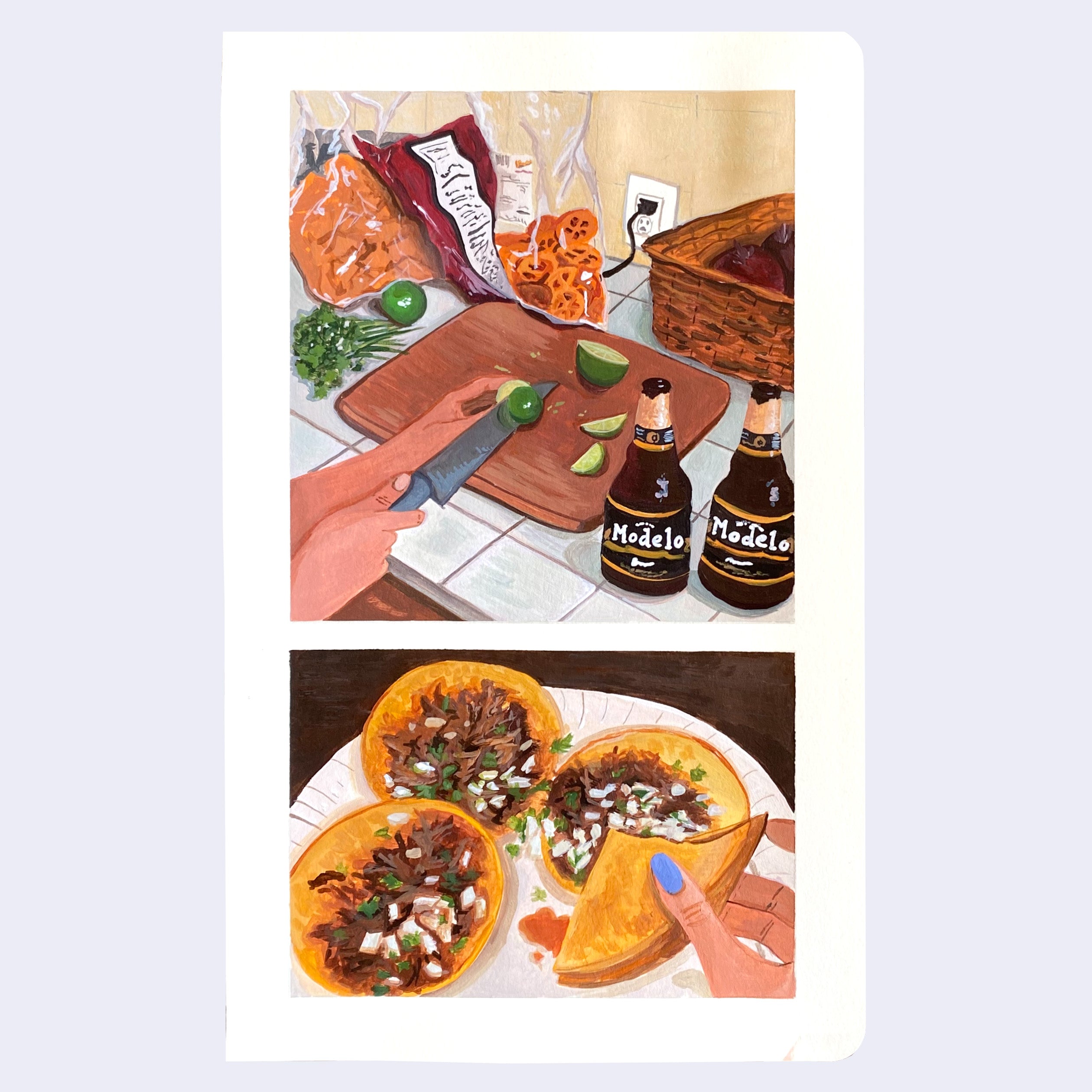 2 paintings on one page. Larger painting is of a person cutting lime on a cutting board, with 2 Modelos nearby and chips in the background. The second, smaller painting is of 3 tacos on a plate, with 1 being held in someone's hand.