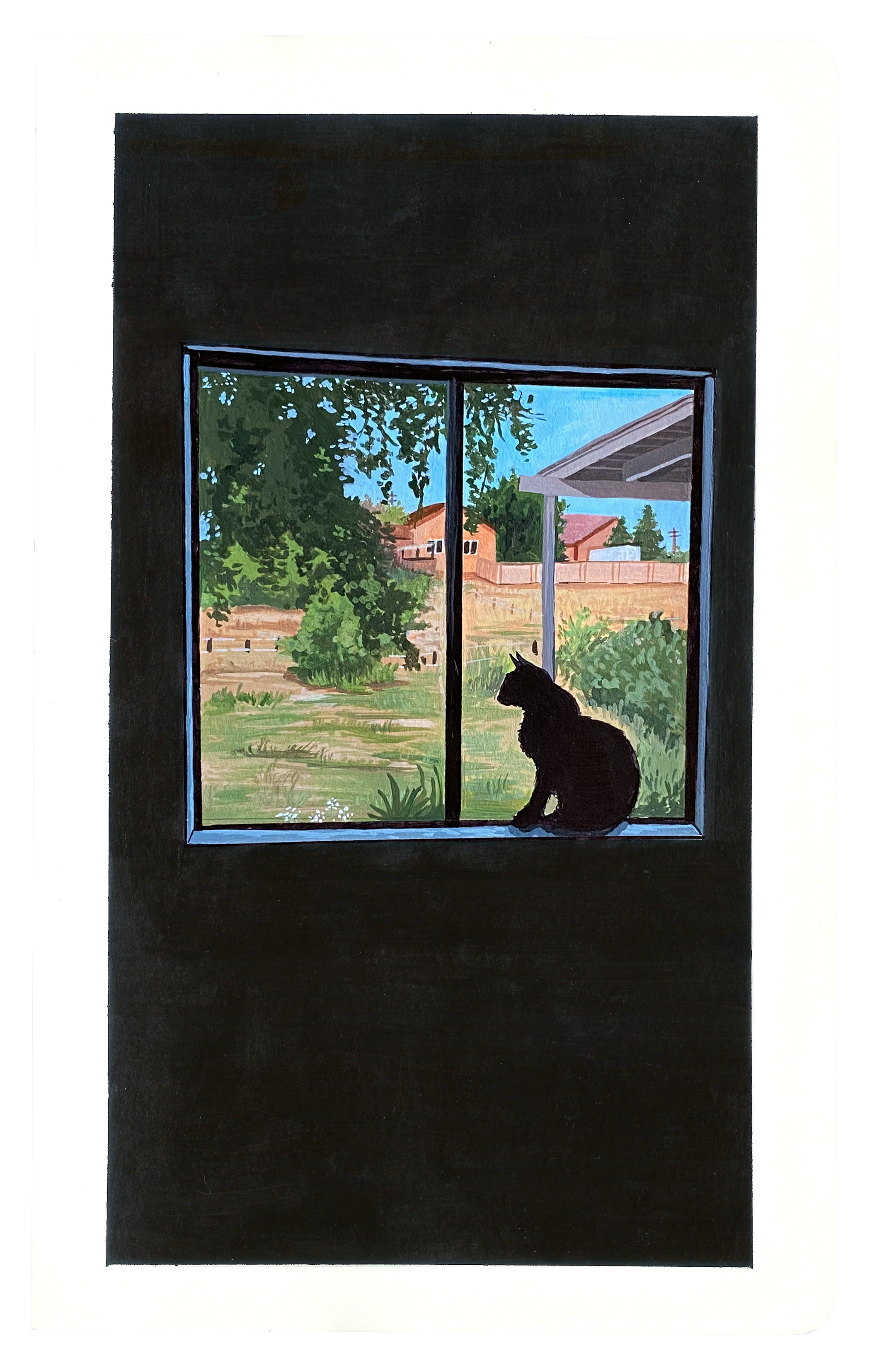 Painting of a mostly black room, with the silhouette of a cat sitting in a window sill. Out the window is a farm setting.