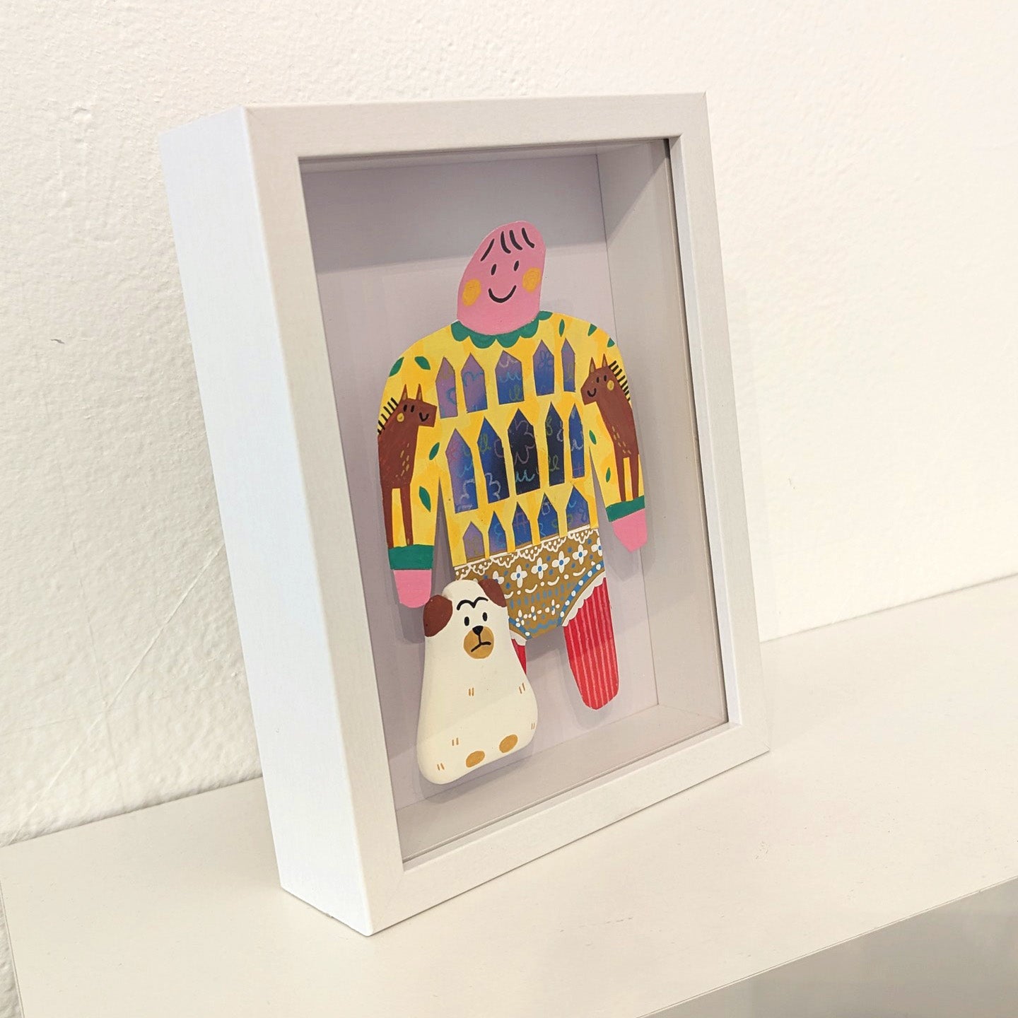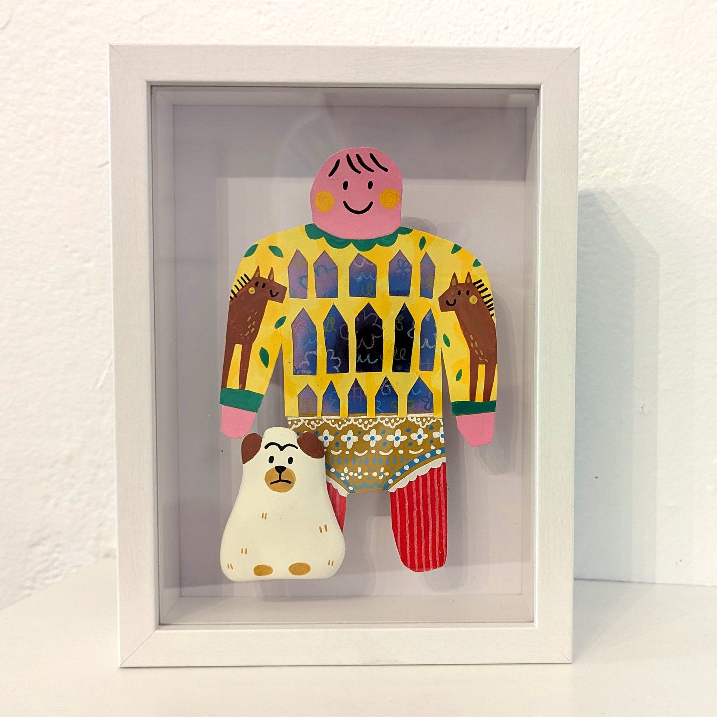 Mixed media (paper, clay). Piece is framed in white shadow box frame.
