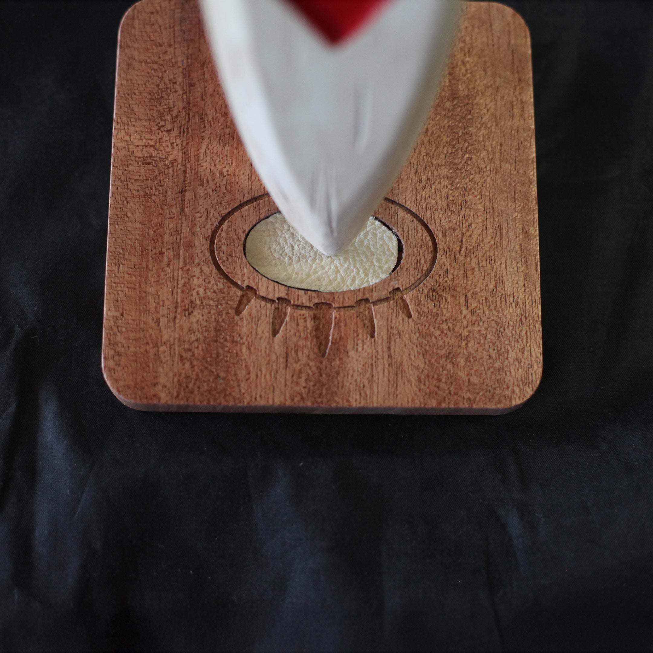 Wood, Leather, Acrylic Paint, Glue, Polycrylic. Comes with display stand.