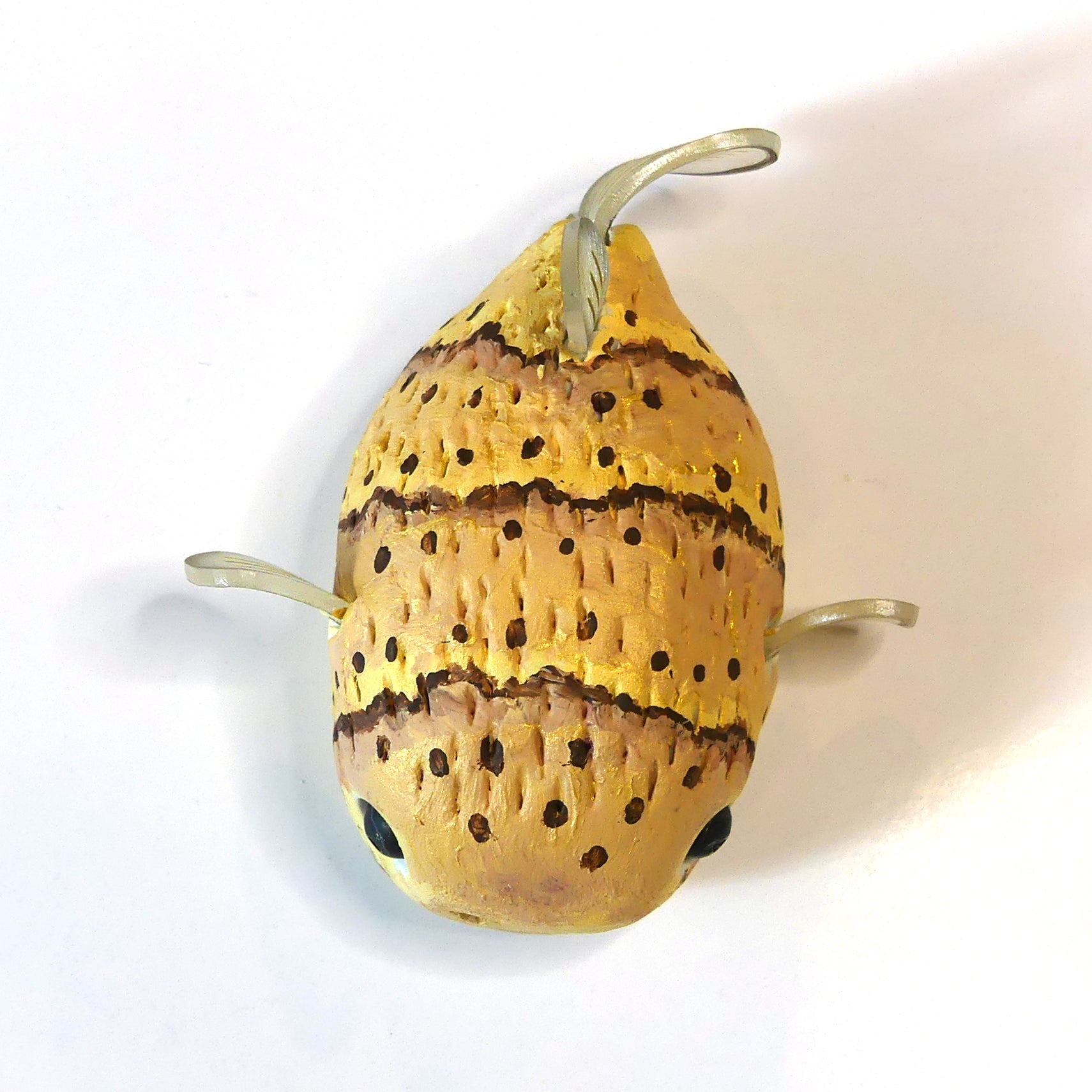Polymer clay, acrylic gouache, lava rock beads, shrink plastic, ink, gold pencil.