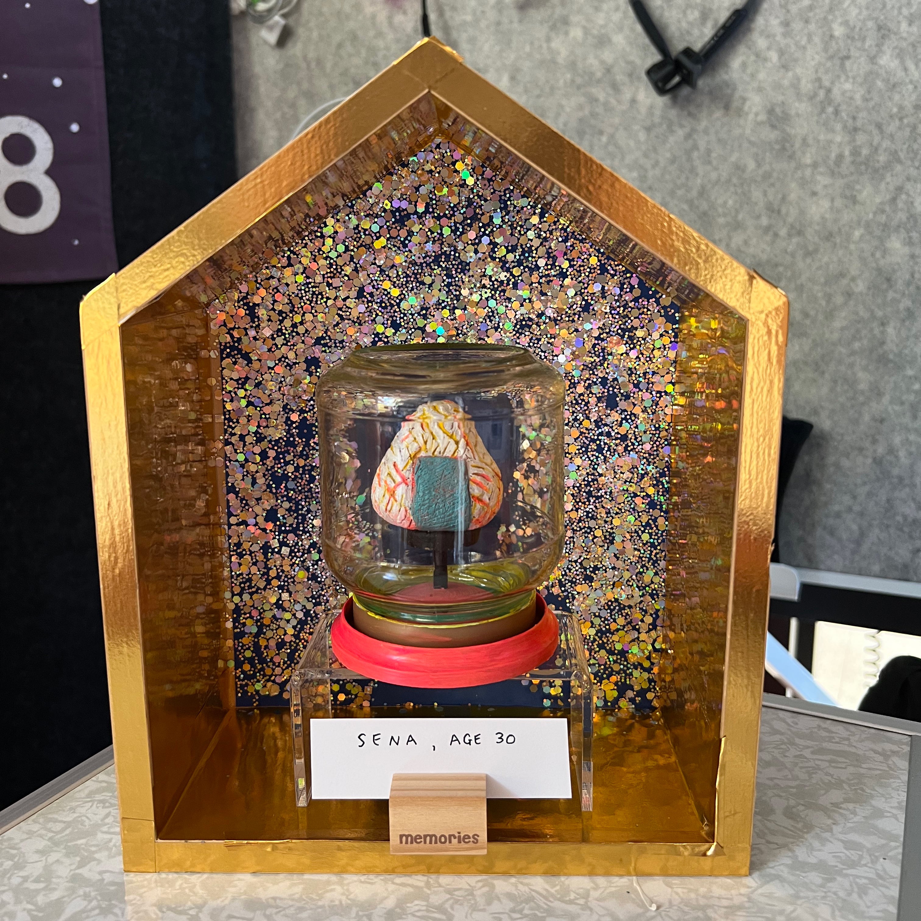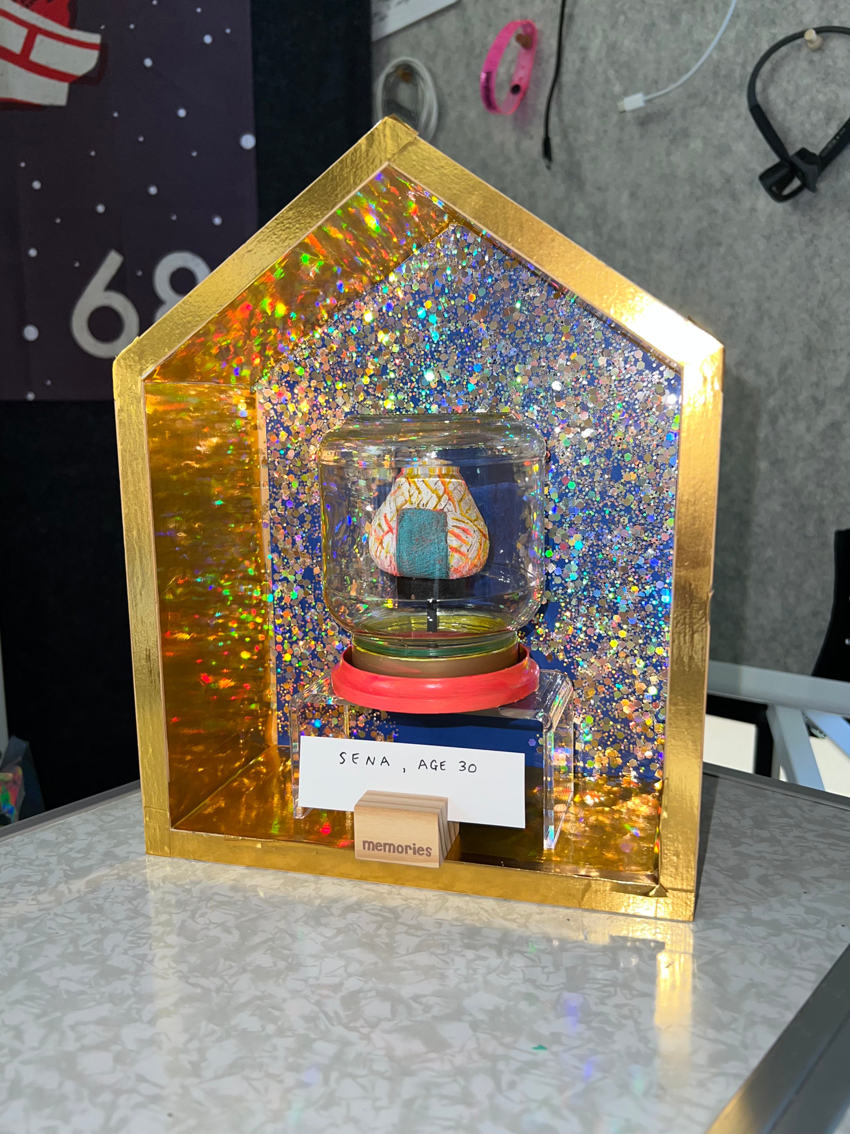Wood, paper, repurposed jar, acrylic stand, glitter, rubber cement, super sculpey, acrylic paint.