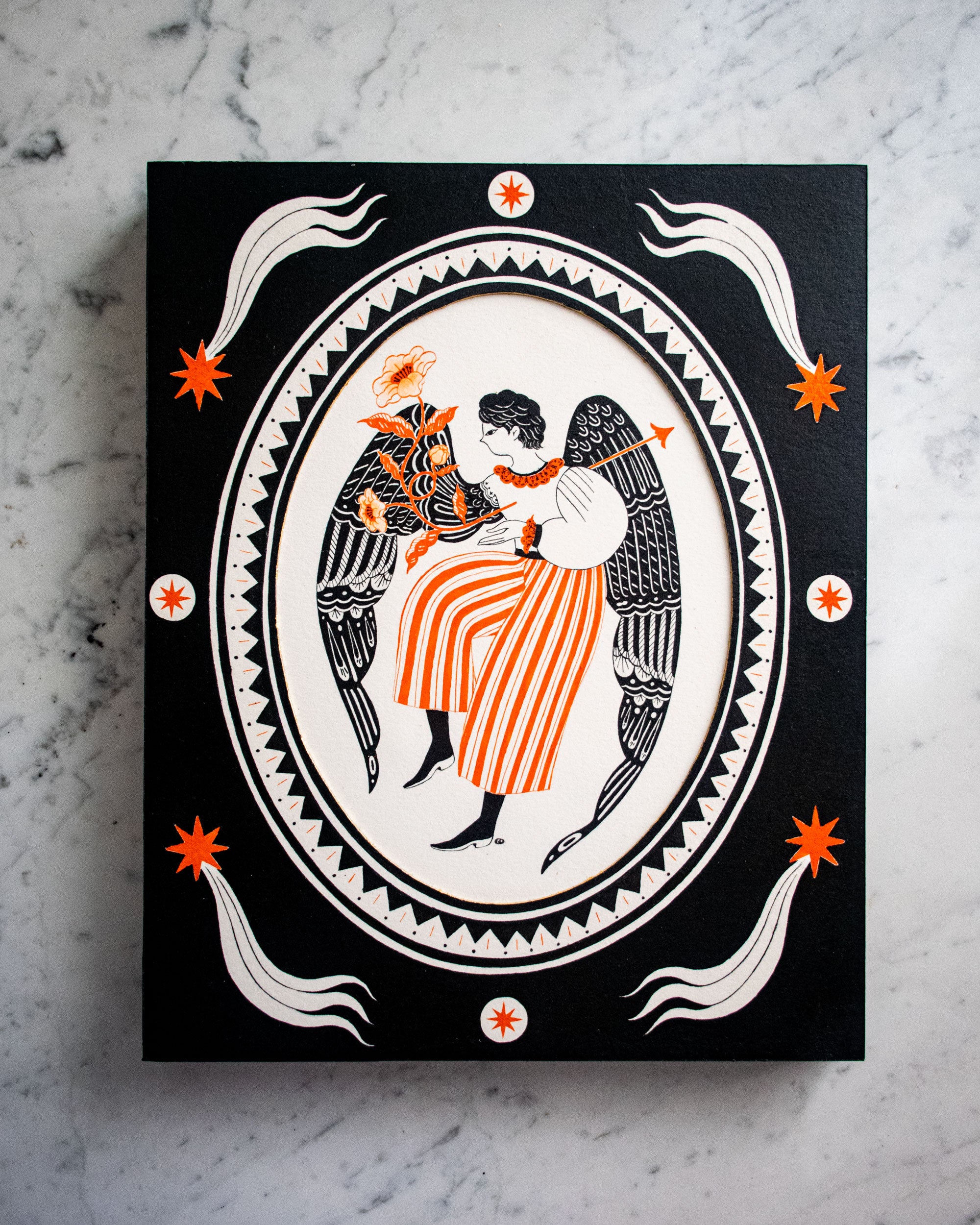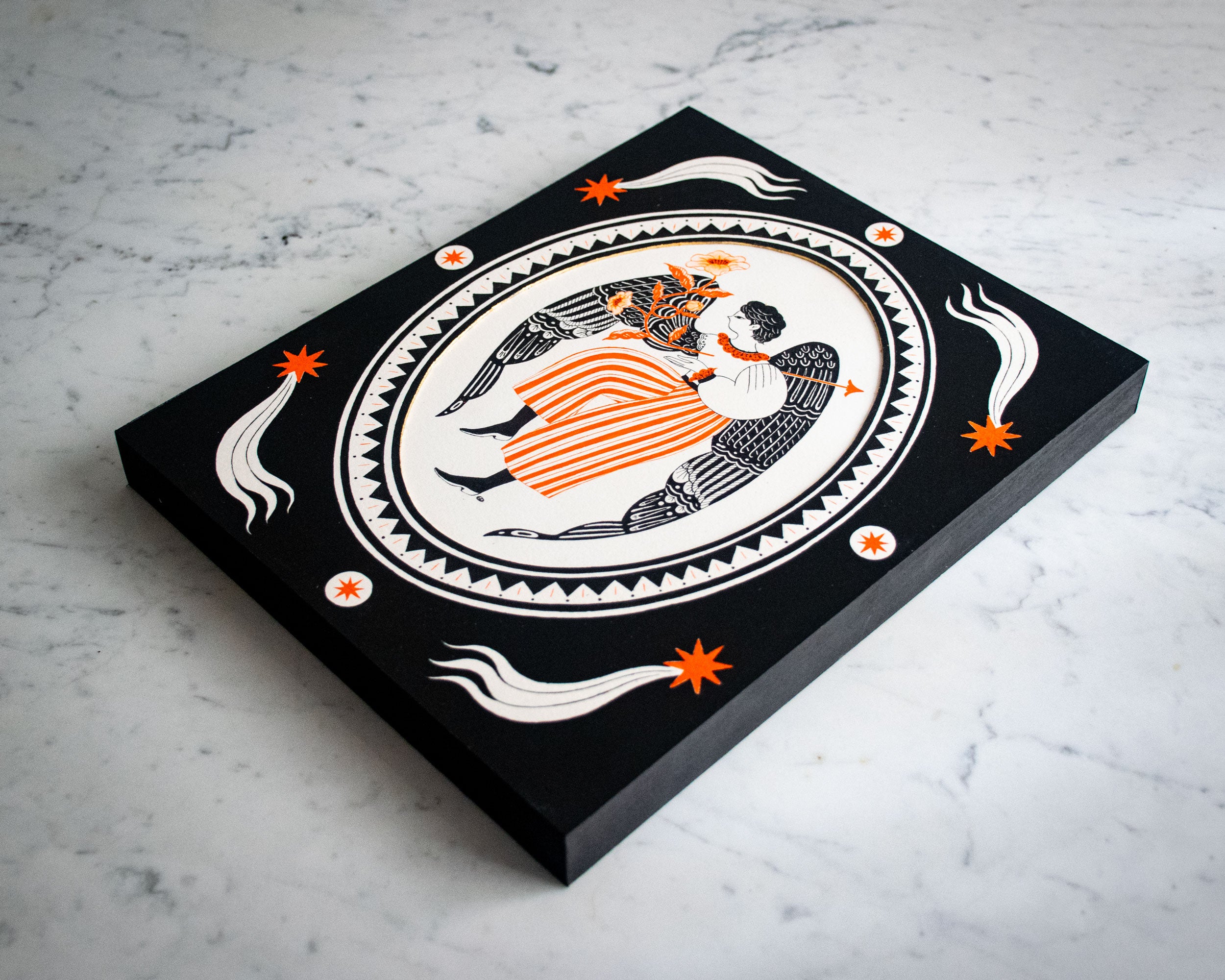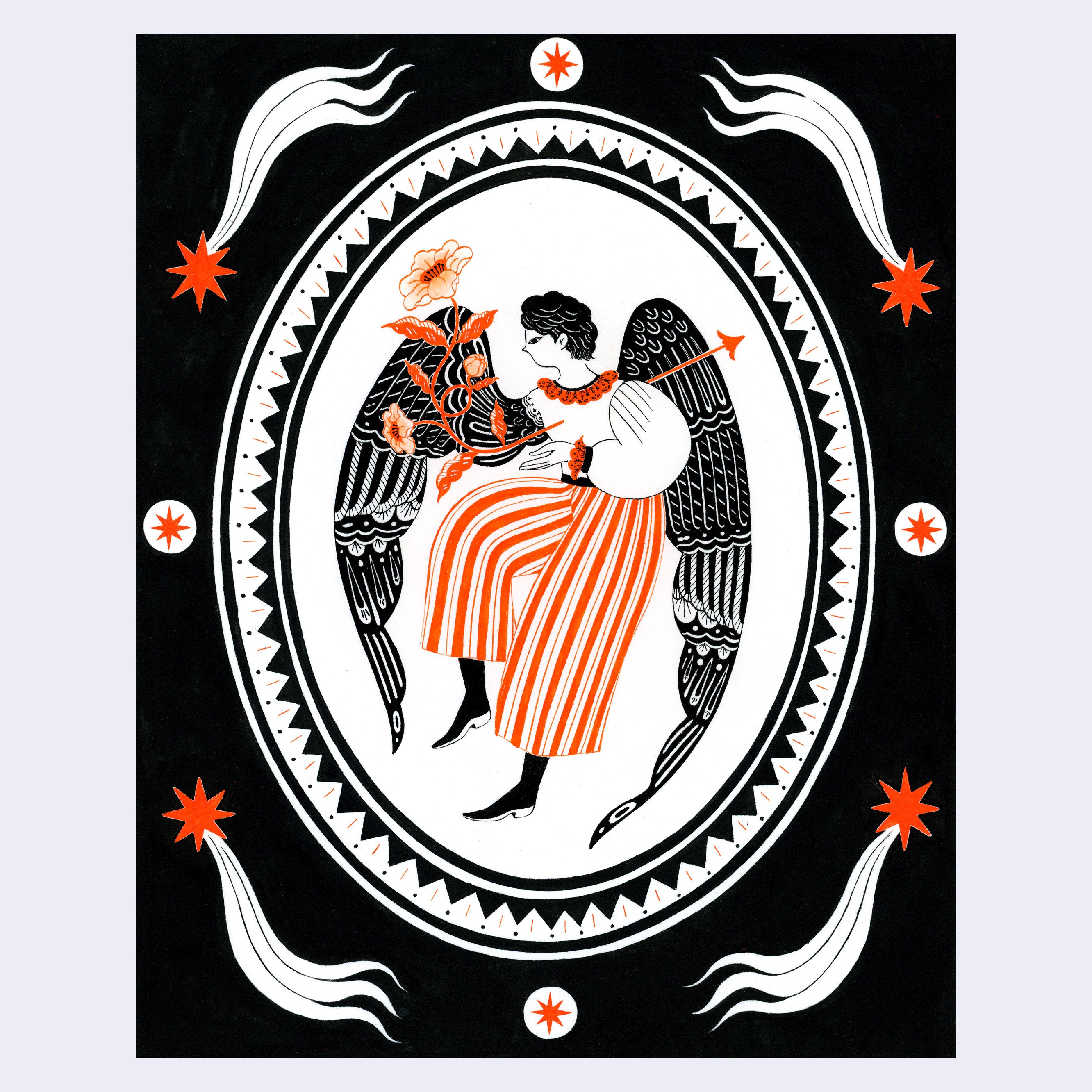 Dip pen and sumi ink illustration on watercolor paper, which was then mounted on a wood panel, and embellished with gold leaf.