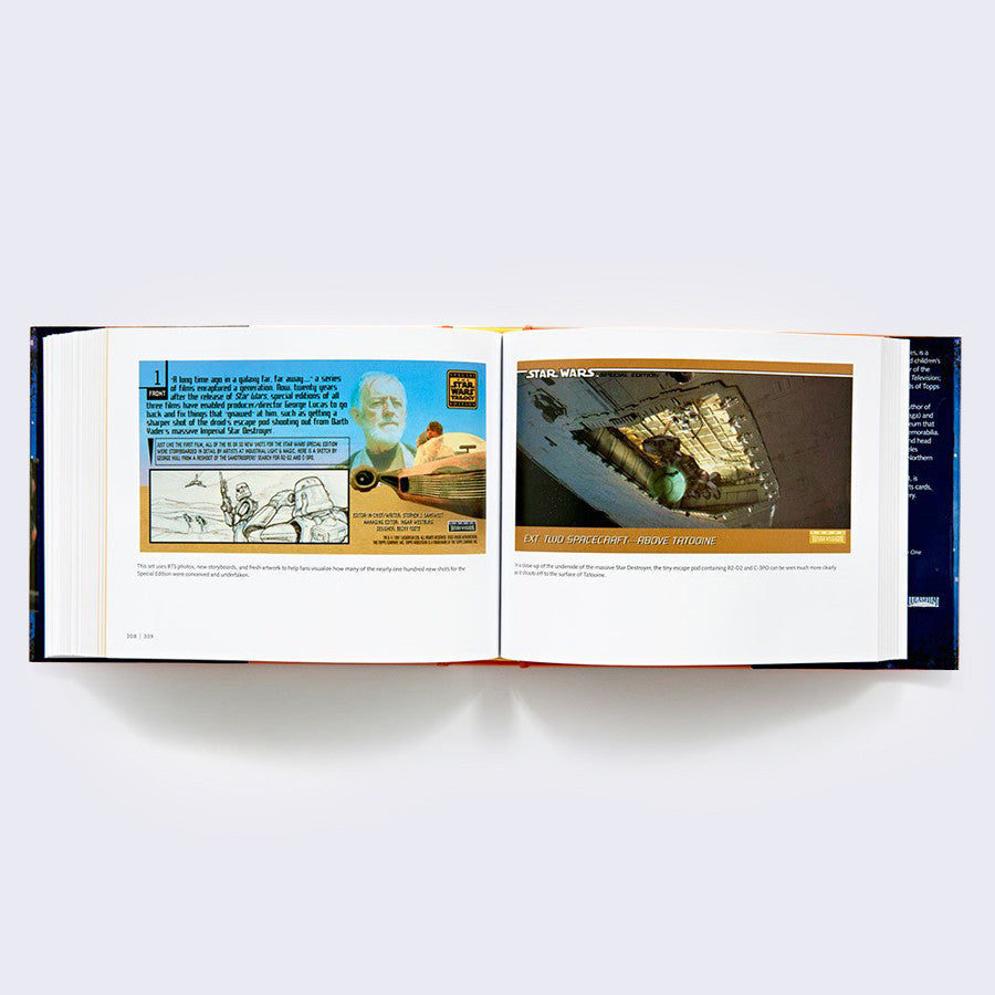 Following the successful release of multi-series trading cards based on the originalStar Wars film series (1977–83), Topps released the first volume of its Widevision series in 1995. These special cards were just as tall as the standard Topps trading cards but twice as long—a format that better reflected the widescreen dimensions of the films. Now, for the first time, every card, as well as rare promotional cards and limited edition chase cards, are reprinted in one deluxe collection. This new volume includes the fronts and backs of each card, showcasing original storyboards, fun facts, filmmaker quotes, behind-the-scenes photos, and exclusive commentary by George Lucas.