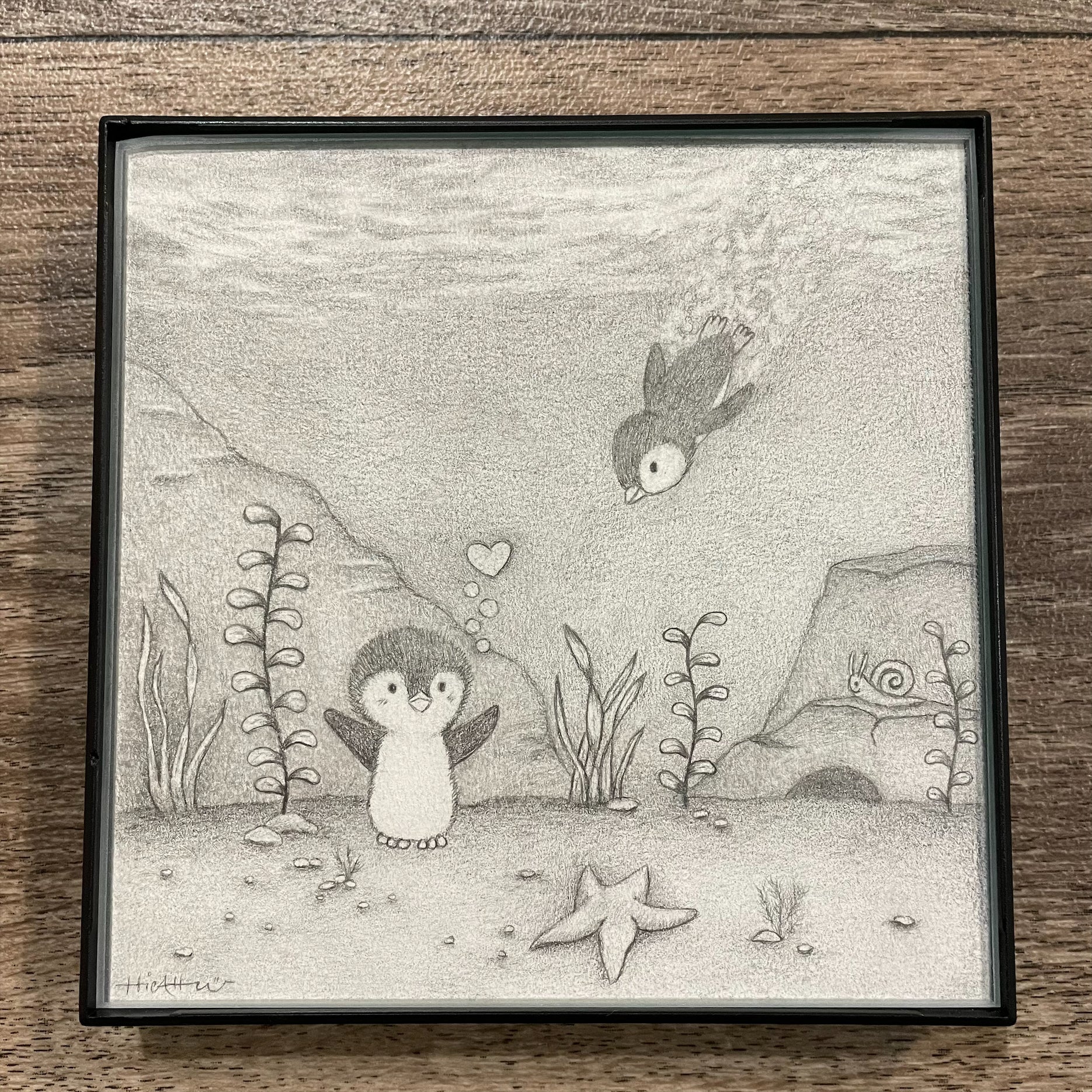 Graphite drawing of a small penguin standing underwater, with a heart bubble coming up from it. Another penguin swims down towards the other. Piece is in thin black frame.
