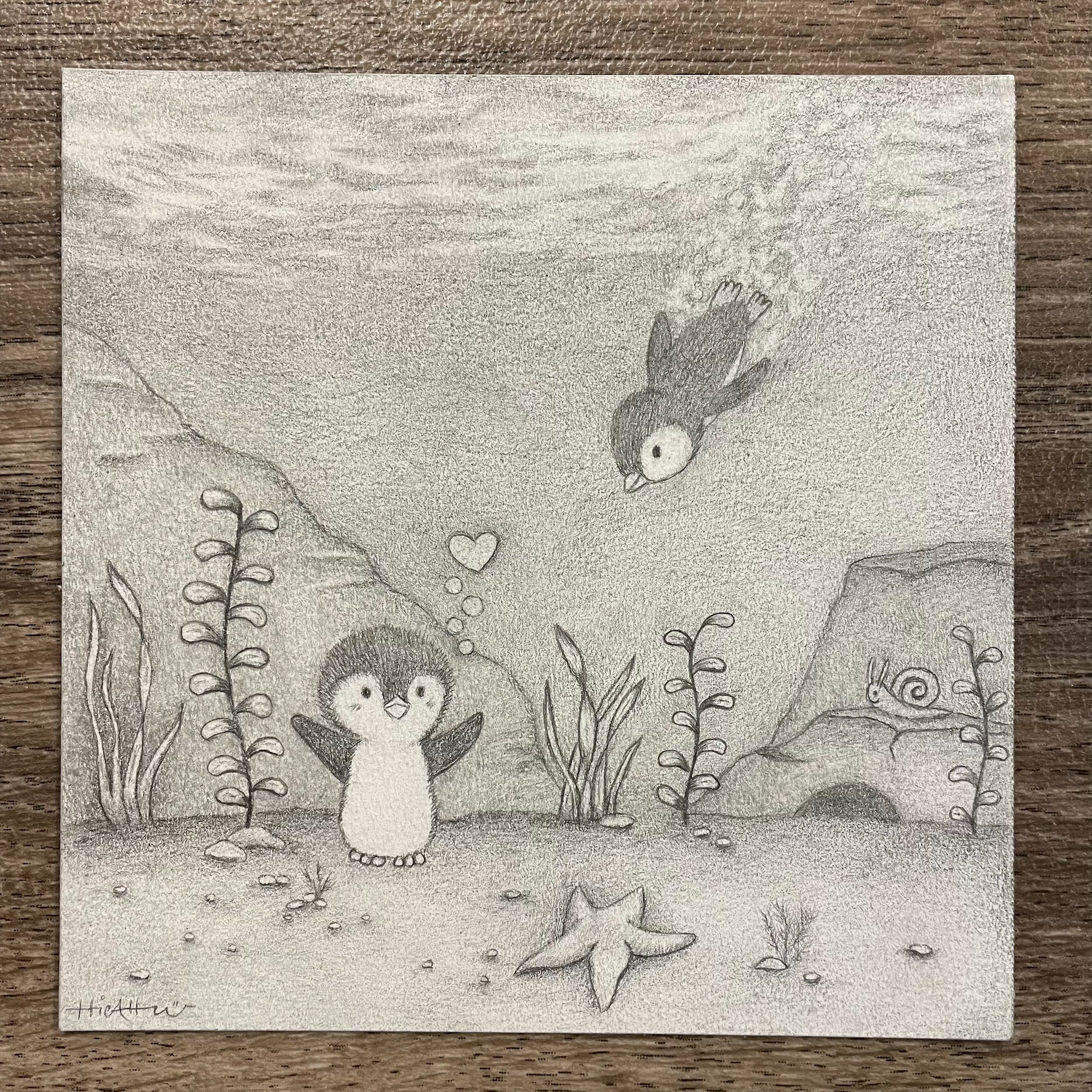 Graphite drawing of a small penguin standing underwater, with a heart bubble coming up from it. Another penguin swims down towards the other.