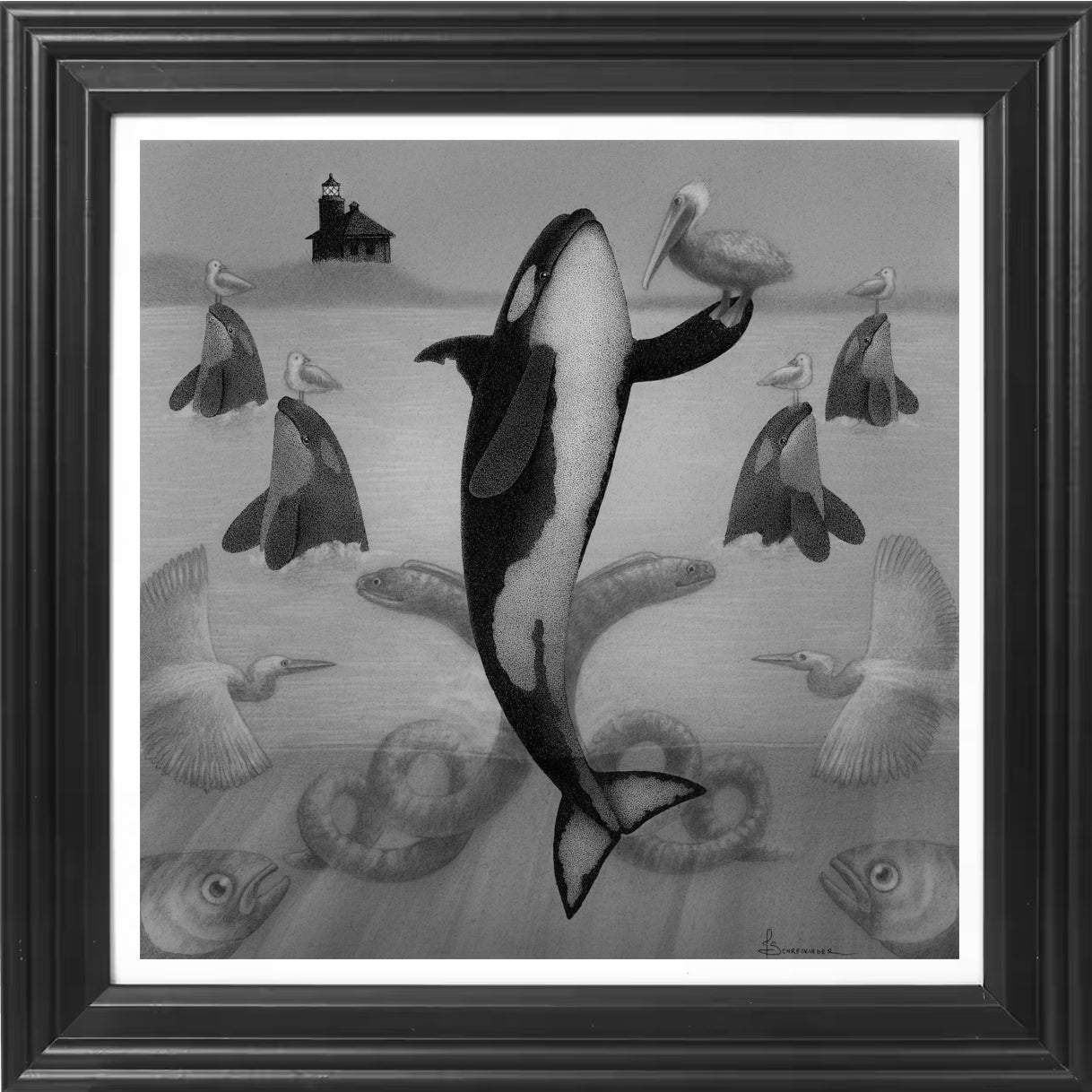 Artwork measures 9 x 9 inches, framed to 11 x 11 inches.
