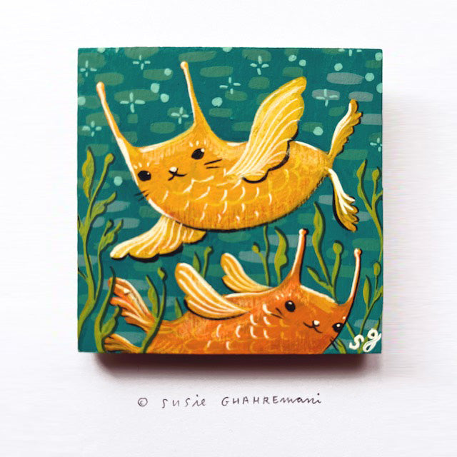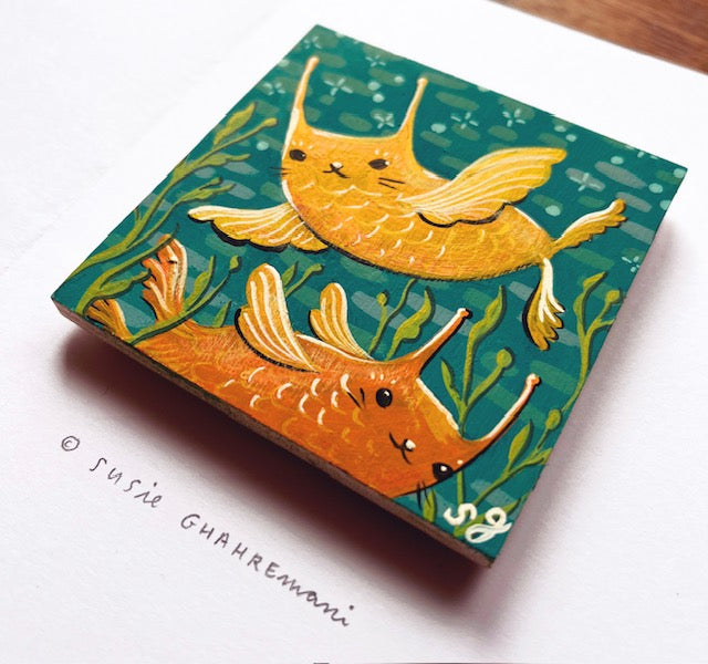 Painting of 2 fish, one yellow and one orange, both with cat faces. They swim over one another against a teal background with kelp.
