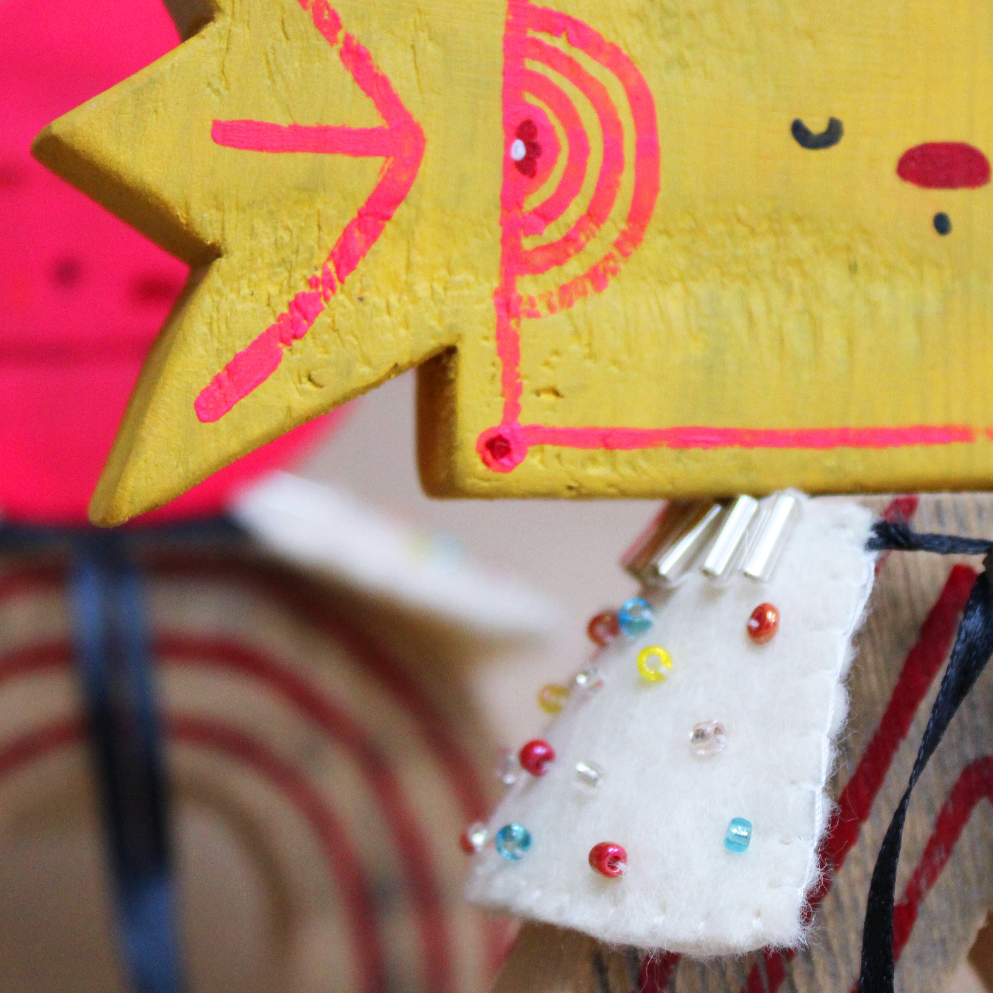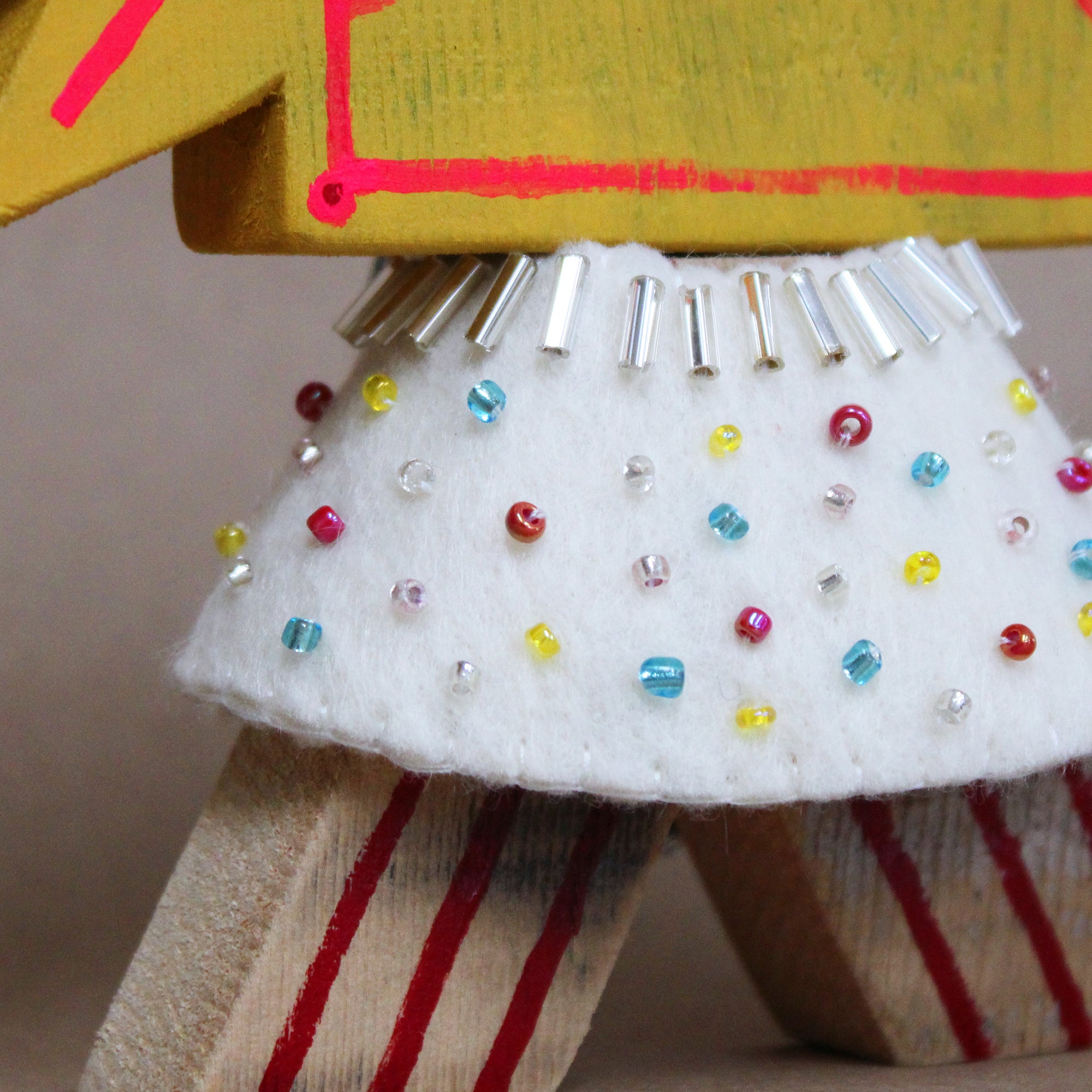Wooden sculpture of a yellow wrapped piece of candy with a painted on face. Its head is attached to a triangular shaped body with no limbs. It wears a white cape with colorful sparkles.
