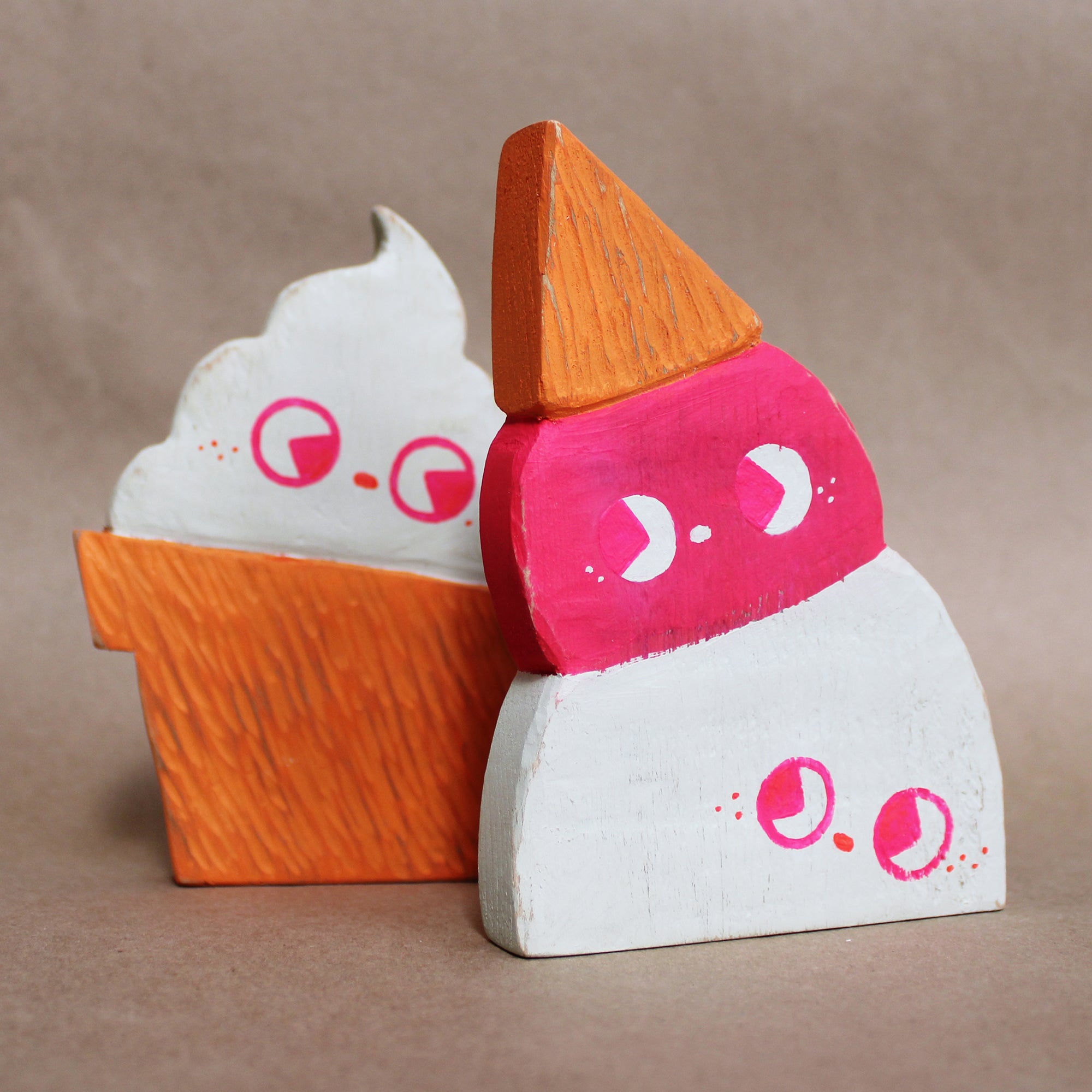 Die cut painted wooden sculpture of an upside down double scoop ice cream cone. One scoop is pink and the other is white, they both have cute drawn on faces looking off to the side.