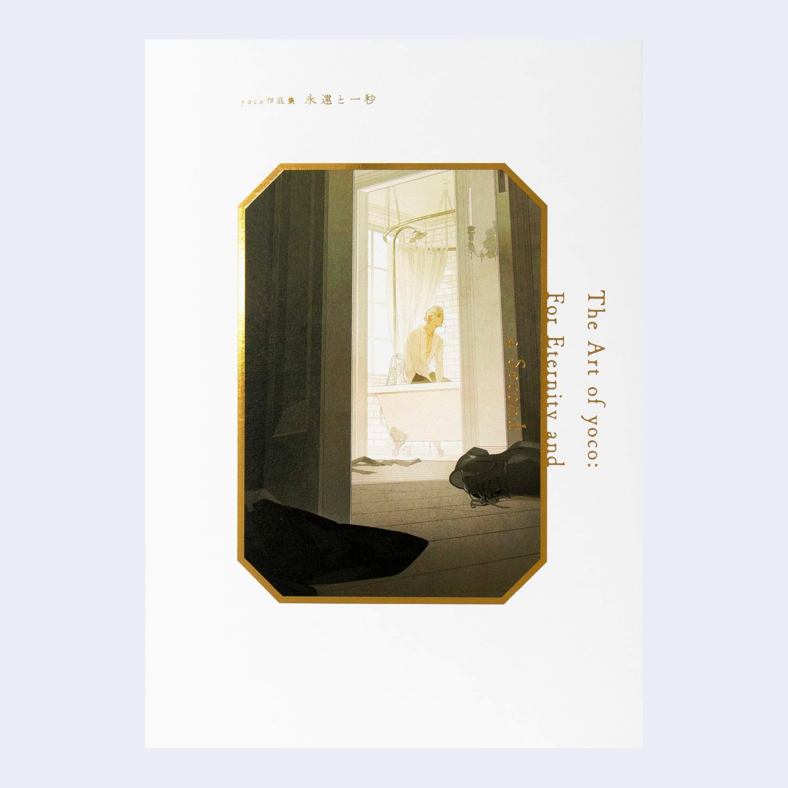 Book cover for The Art of yoco, mainly white with a framed illustration of a man sitting on the edge of a bathtub with his clothes on, smoking a cigarette.