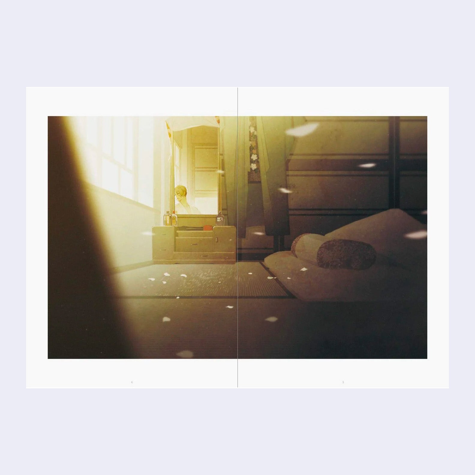 Full spread 2 page illustration of an interior scene with deep browns and soft yellow lighting coming in from the side window. A mirror shows the reflection of a man, who looks off to the side.