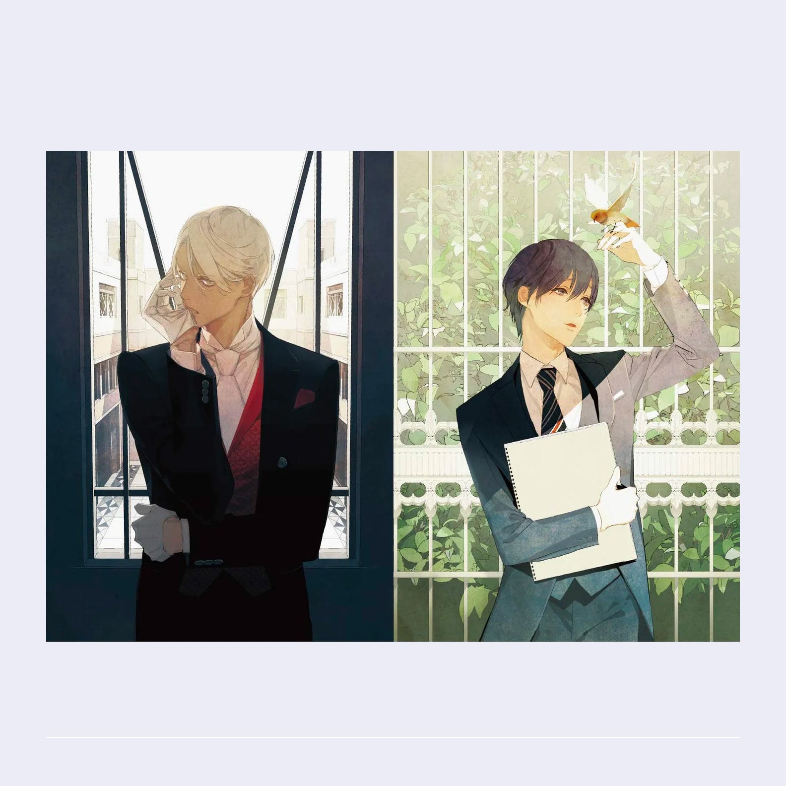 2 page spread of 2 illustrations, 1 on each page. A man in a tuxedo stands in front of a doorway. He raises one of his gloved hands to his mouth and bites it. The other is a man in a suit, holding a notepad and extending out his arm for a bird to land on it.