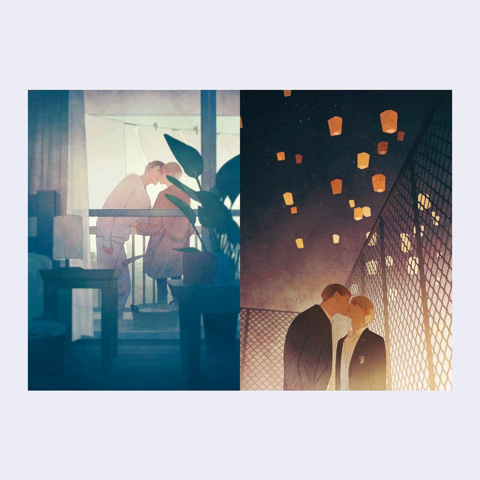 2 page spread of 2 illustrations, 1 on each page. Both depict 2 men kissing one another, the first scene is on a balcony seen through the apartment. And the other is outside and a lantern festival, against an iron fence.