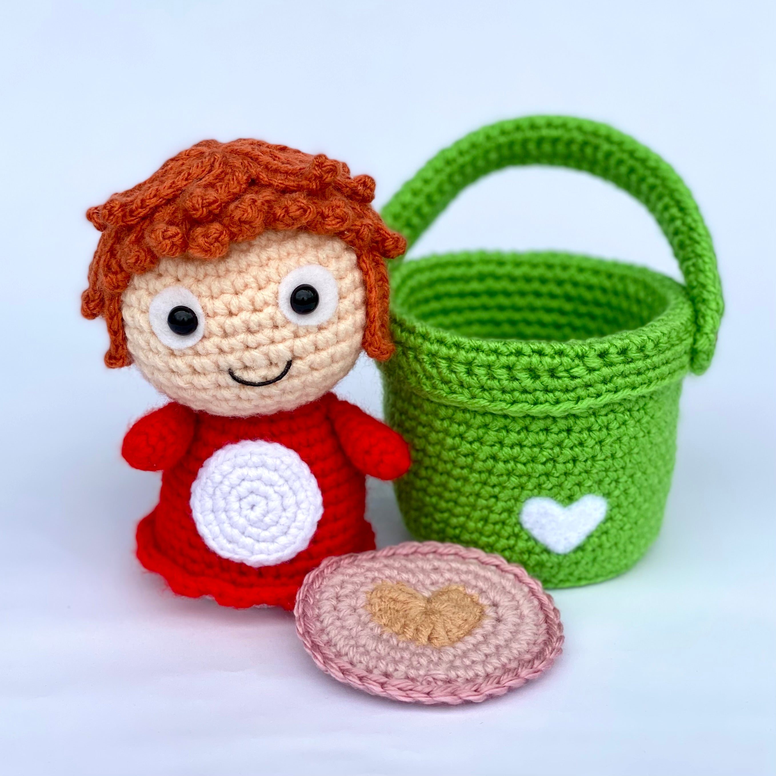Crochet sculpture of a simply designed redhead girl with a red body, aka Ponyo next to an empty crocheted green bucket. In Ponyo's hands is a pink crocheted coaster with a heart in the center.
