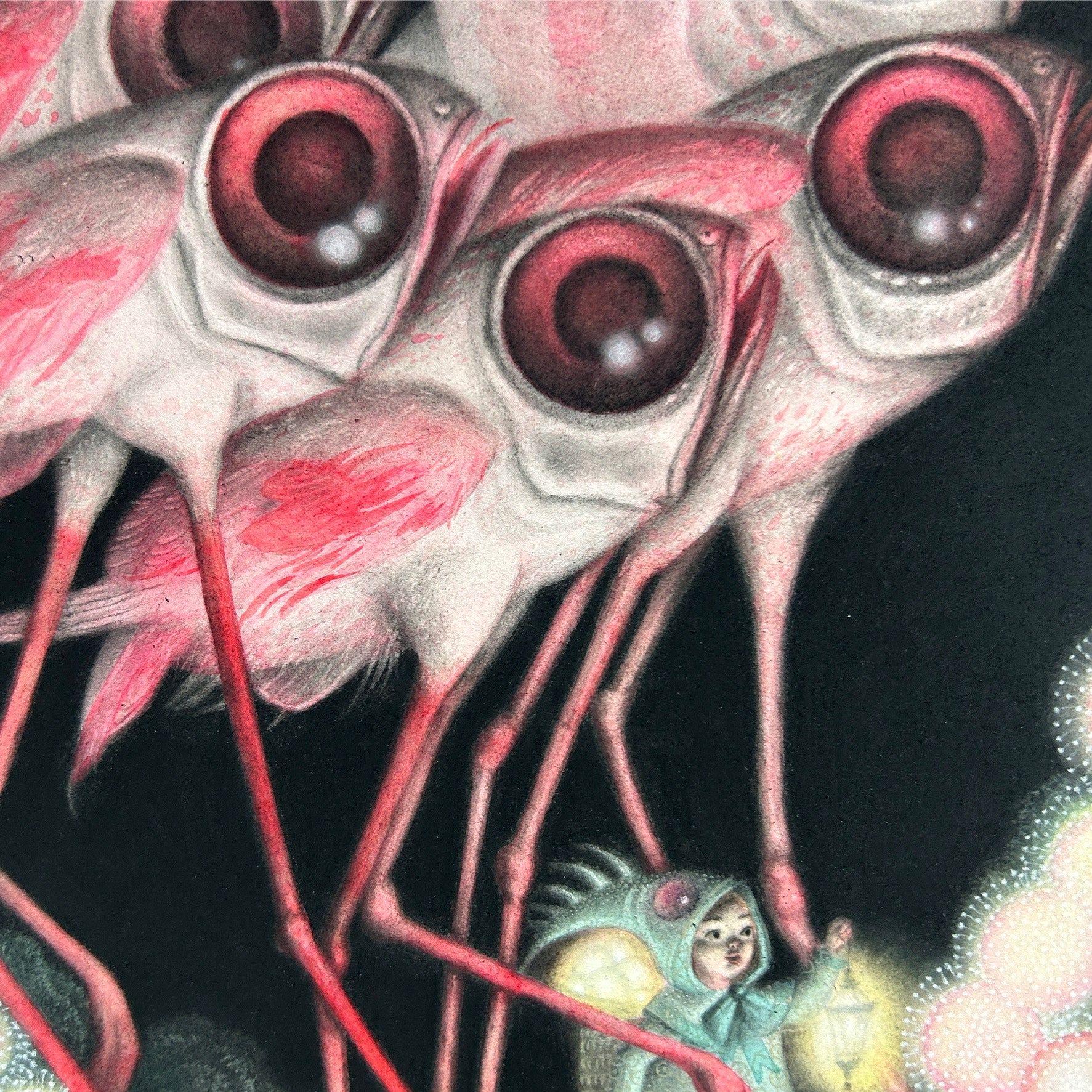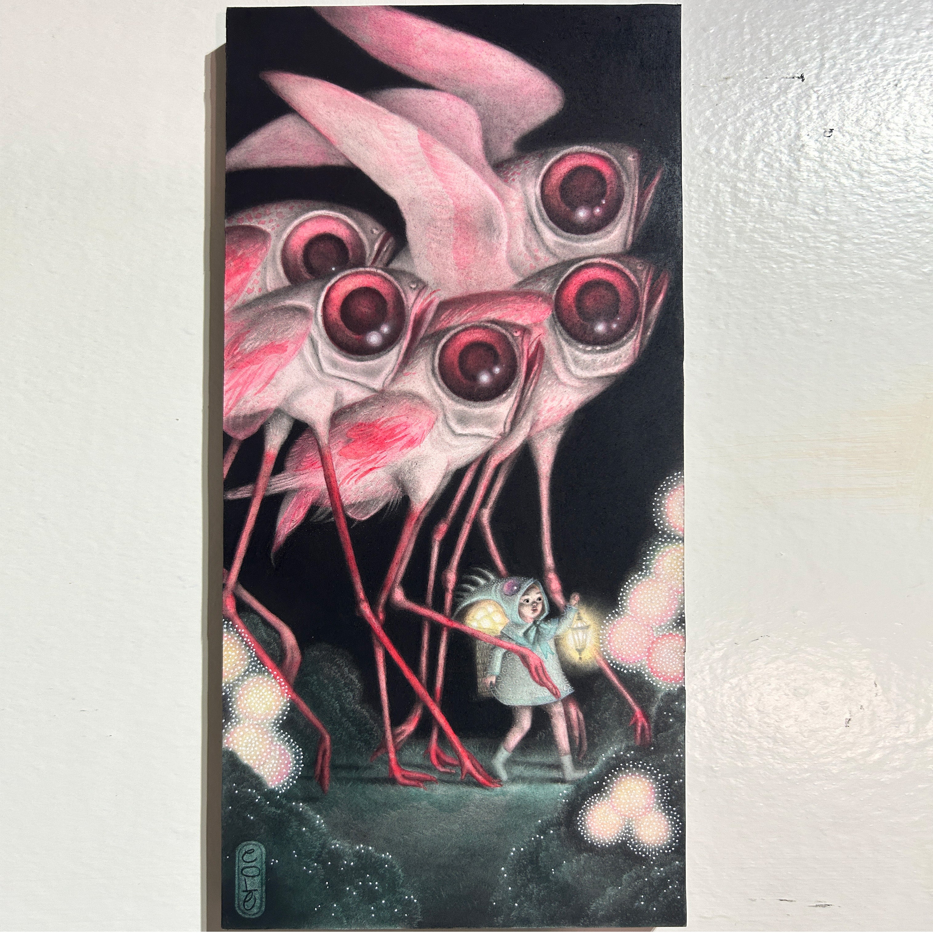 Watercolor, charcoal, chalk pastel and decoupage on watercolor paper mounted to wood panel.