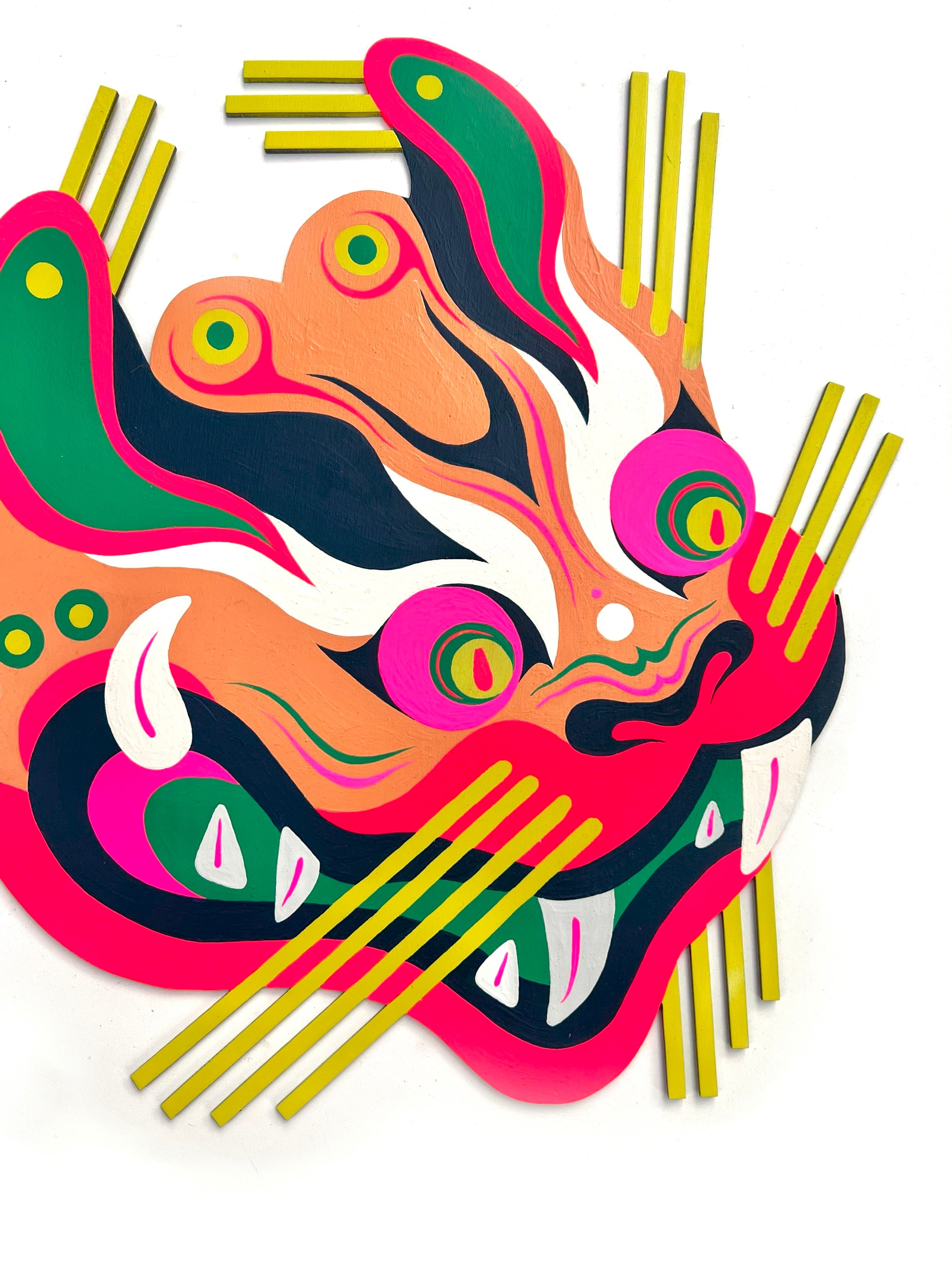 Die cut painted wooden panel of a old Asian style tiger dragon, similar to one in a parade. It is very colorfully painted (orange, pink, green, red) and has sharp curved teeth and yellow lined hair on the sides of its head.