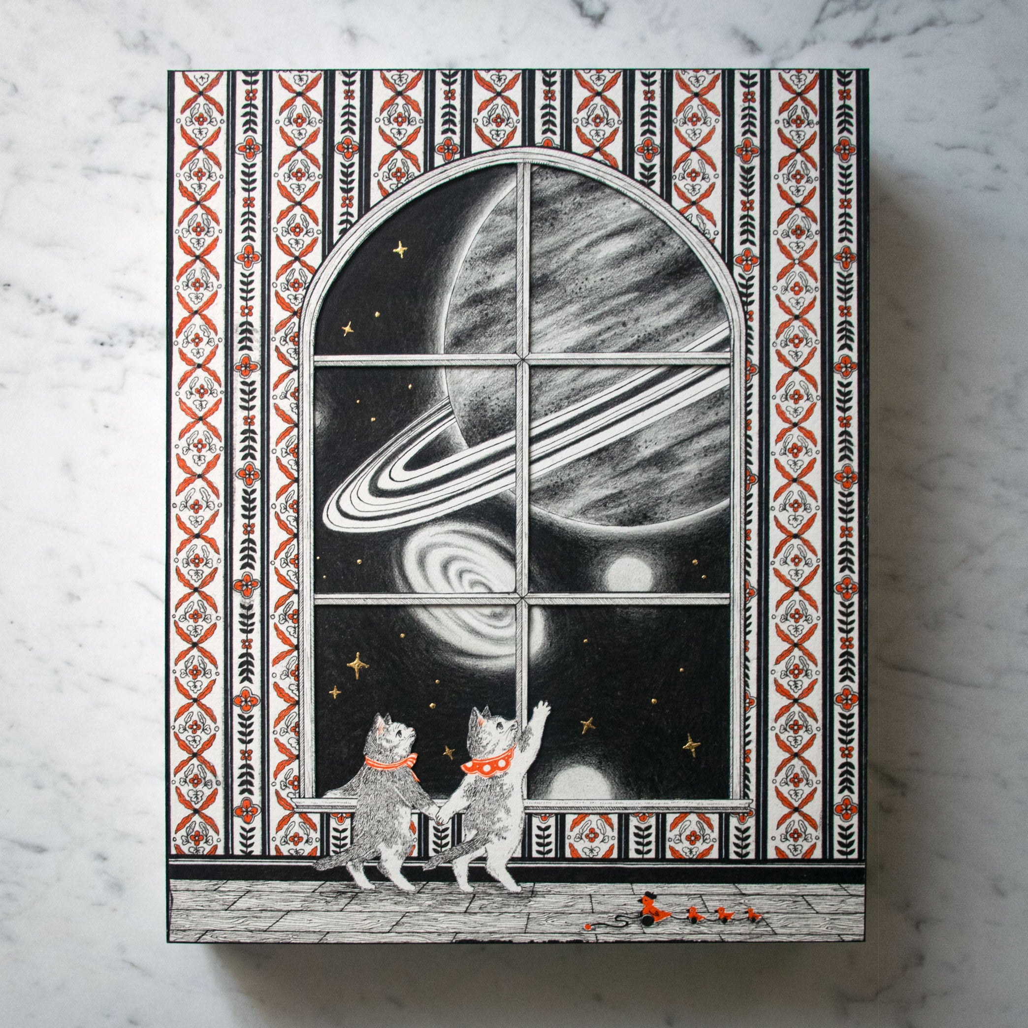 Pen and ink on Arches watercolor paper, embellished with gold leaf and mounted on wood panel.