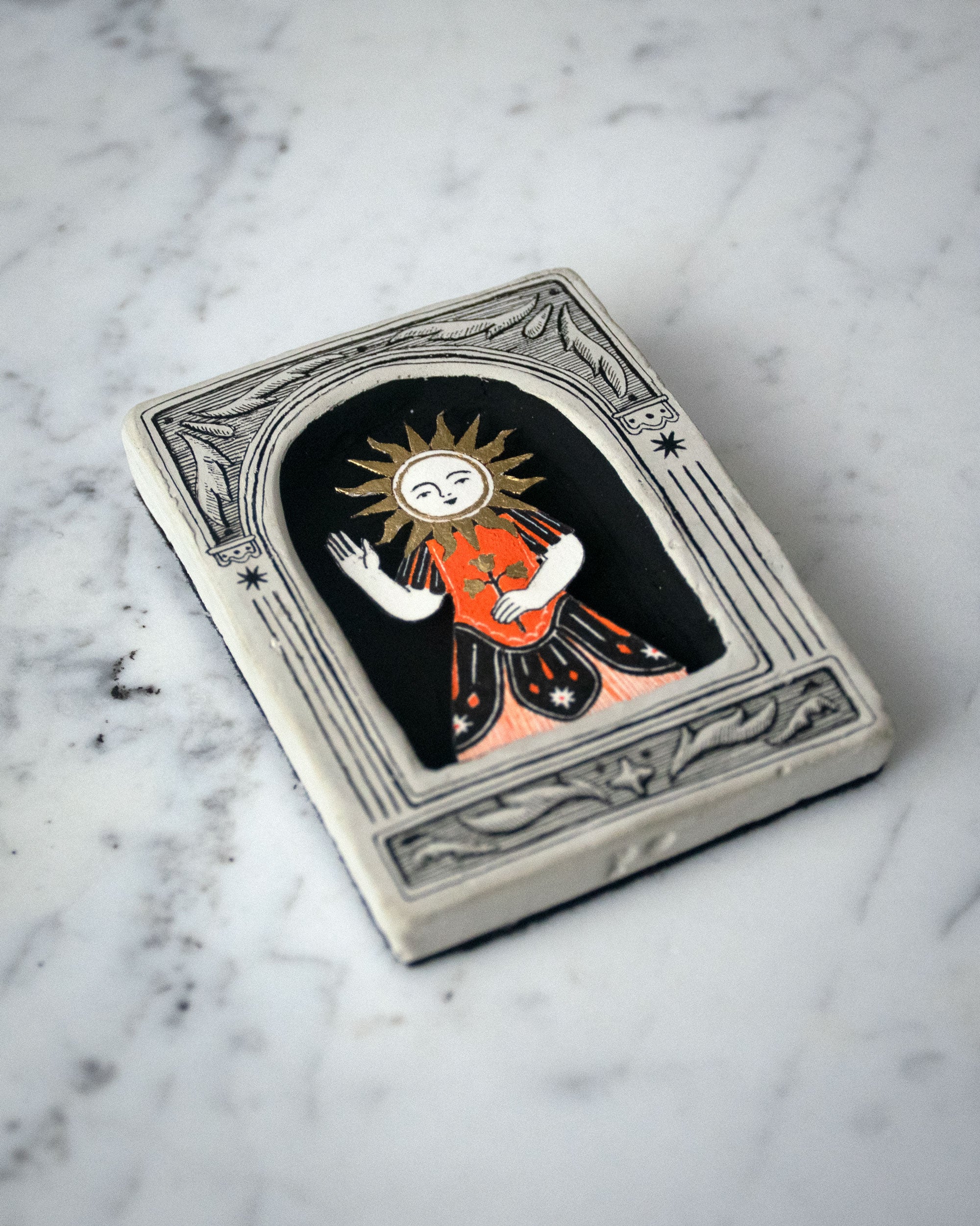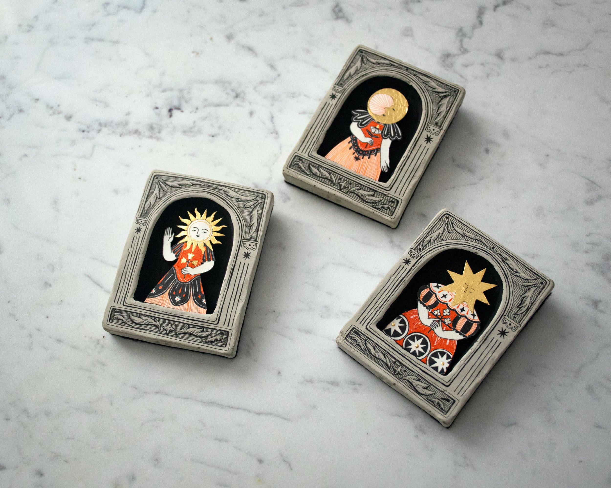 Pen and ink on Arches watercolor paper, embellished with gold leaf and mounted on cement plaque.