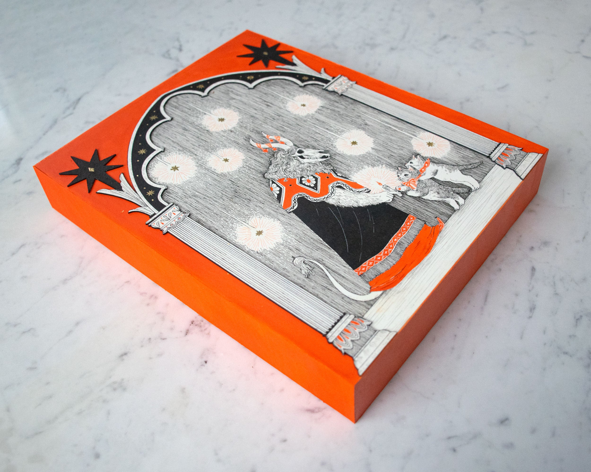 Pen and ink on Arches watercolor paper, embellished with gold leaf and mounted on wood panel.