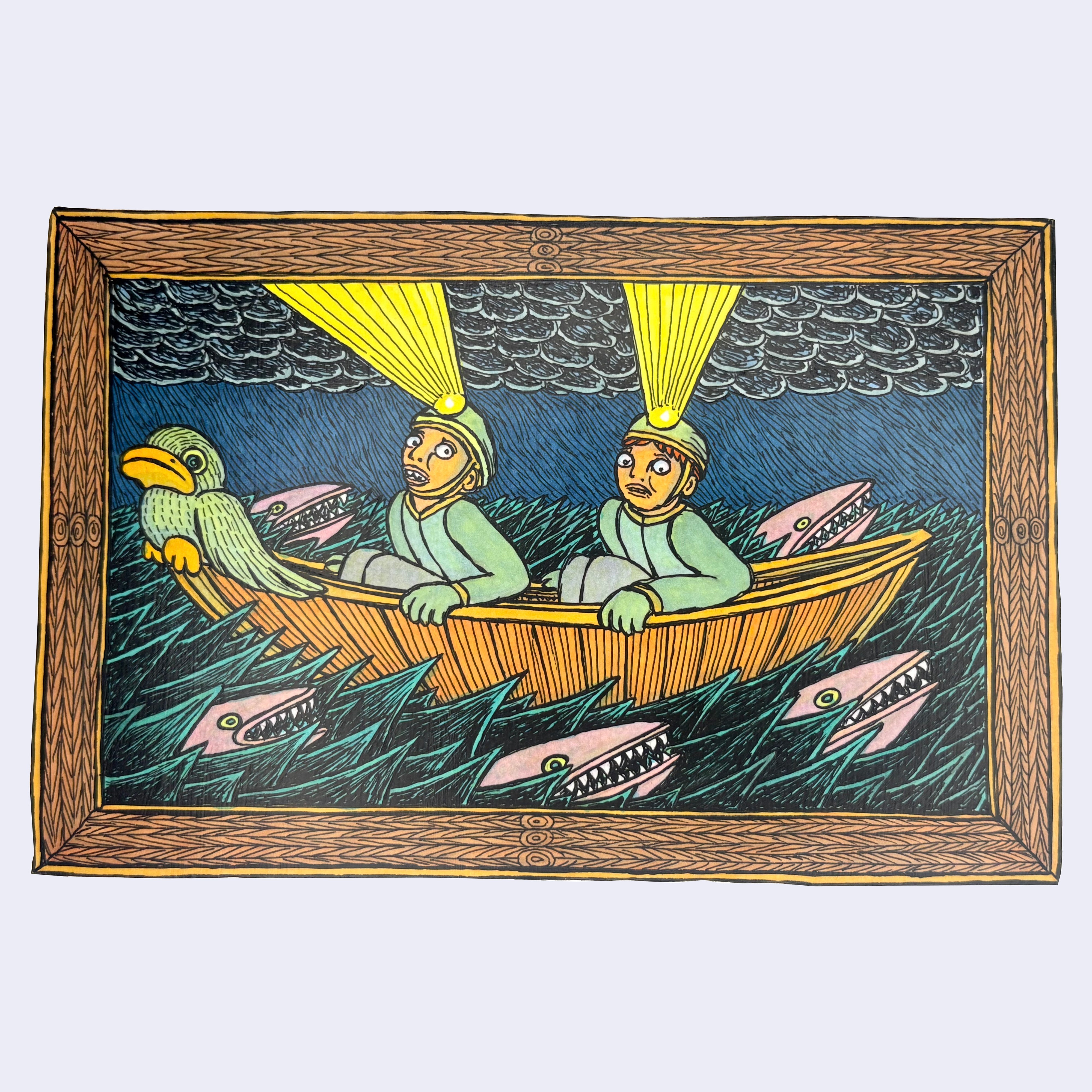 Mixed media (india ink, colored pencil, Copic brush tip markers and varnish) on cut wood panel.