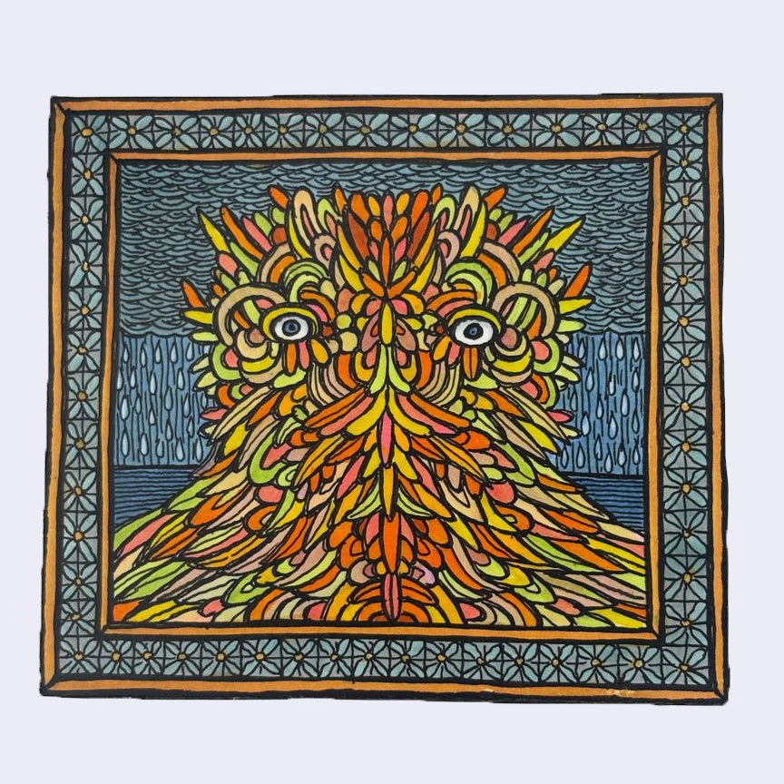 Mixed media (india ink, colored pencil, Copic brush tip markers and varnish) on cut wood panel.