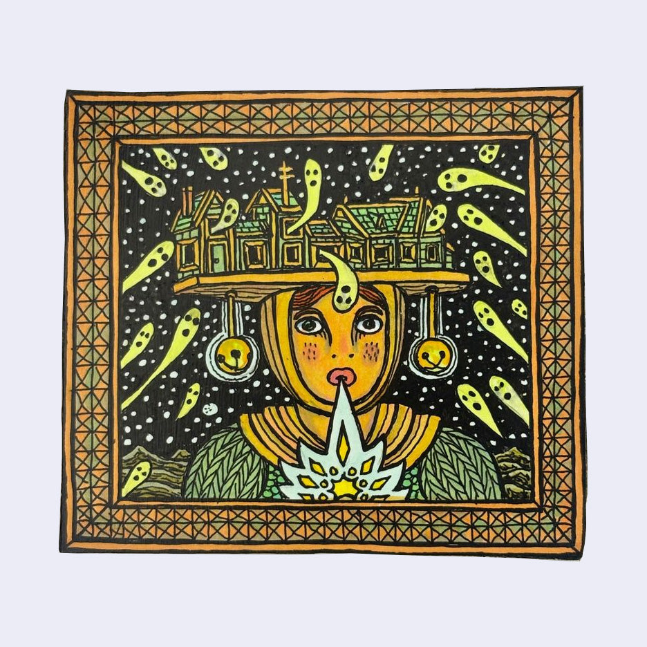 Mixed media (india ink, colored pencil, Copic brush tip markers and varnish) on cut wood panel.