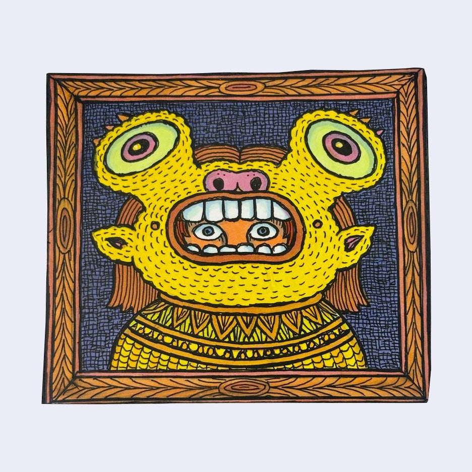Mixed media (india ink, colored pencil, Copic brush tip markers and varnish) on cut wood panel.