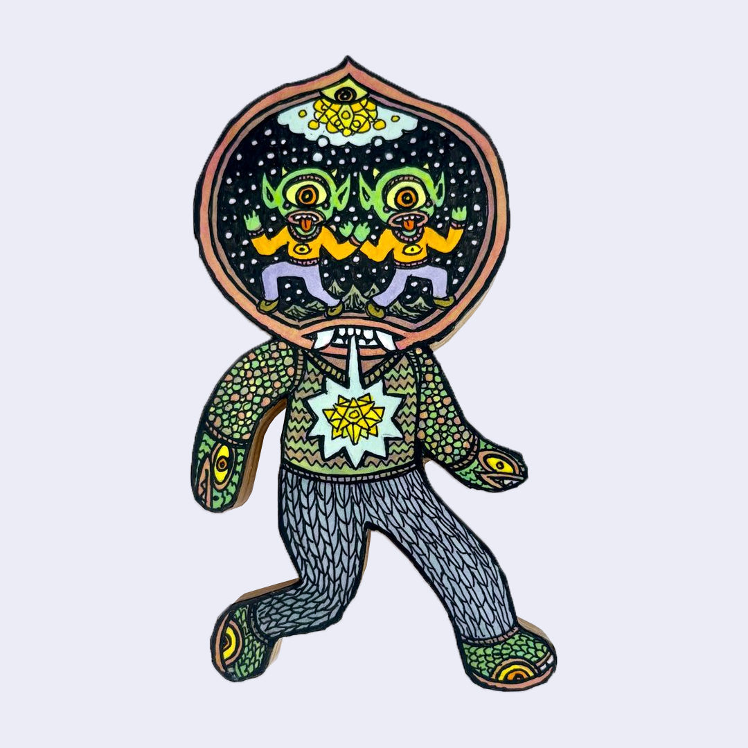Mixed media (india ink, colored pencil, Copic brush tip markers and varnish) on cut wood panel.
