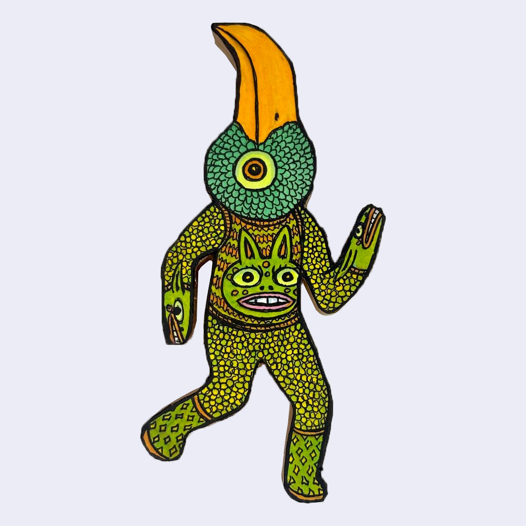 Mixed media (india ink, colored pencil, Copic brush tip markers and varnish) on cut wood panel.
