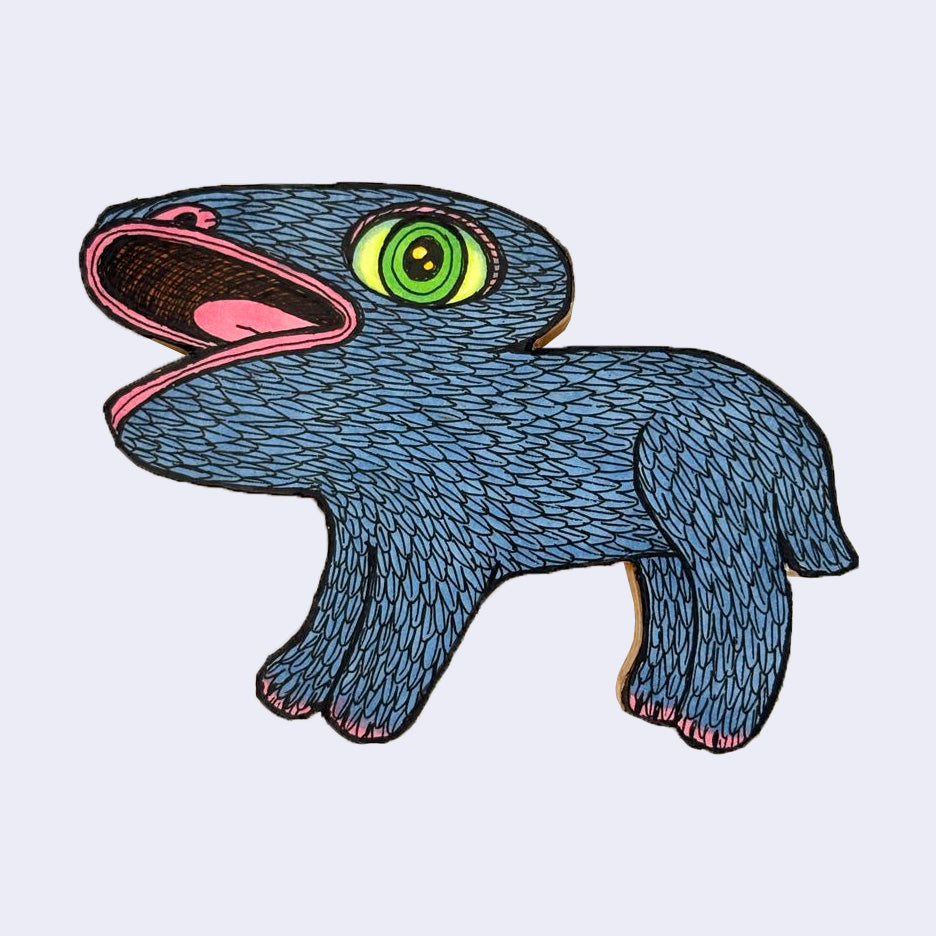 Mixed media (india ink, colored pencil, Copic brush tip markers and varnish) on cut wood panel.