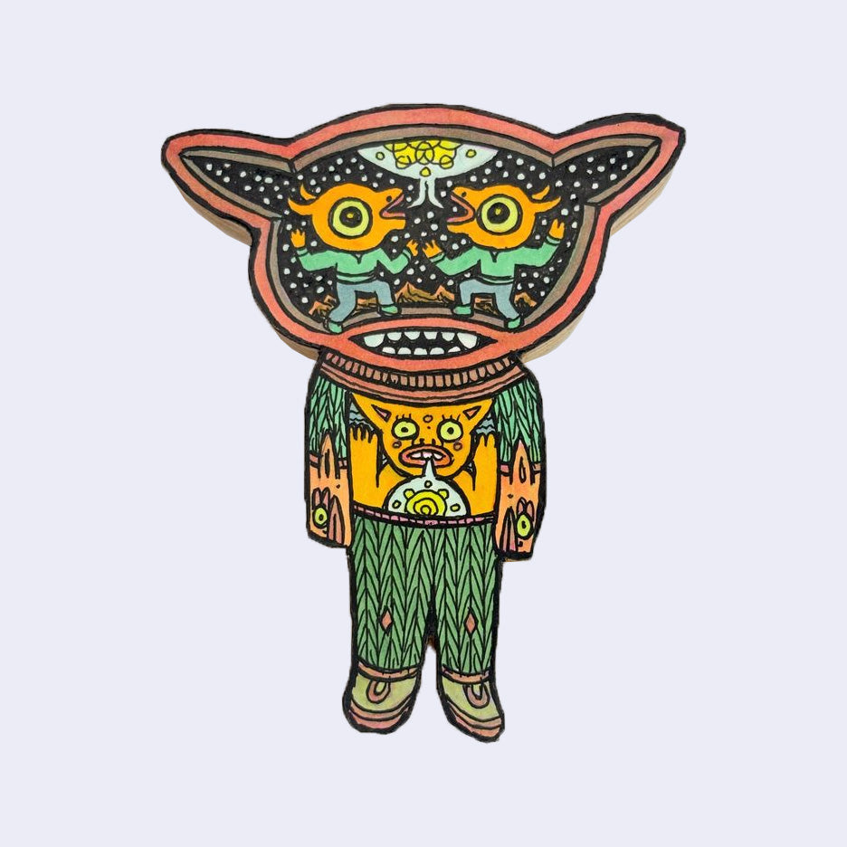 Mixed media (india ink, colored pencil, Copic brush tip markers and varnish) on cut wood panel.