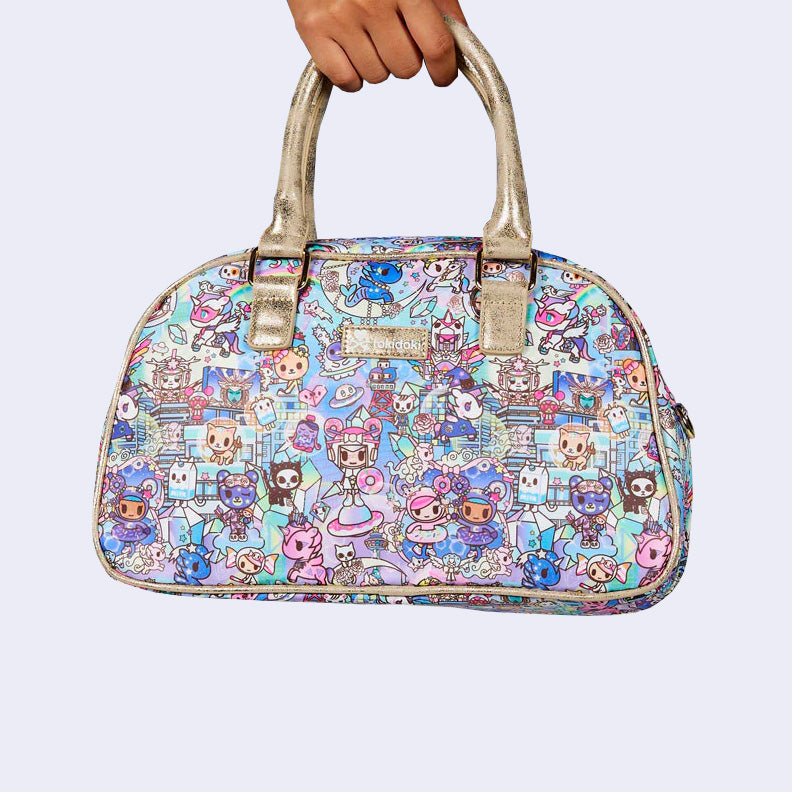 tokidoki's Fall 2023 Collection is here with Digital Princess, a lively, fun collection of bags of all sizes. This series features your favorite tokidoki characters in a sci fi inspired galactic tech wonderland! This bowler bag is the perfect functional accessory, with its bright print and roomy inside!