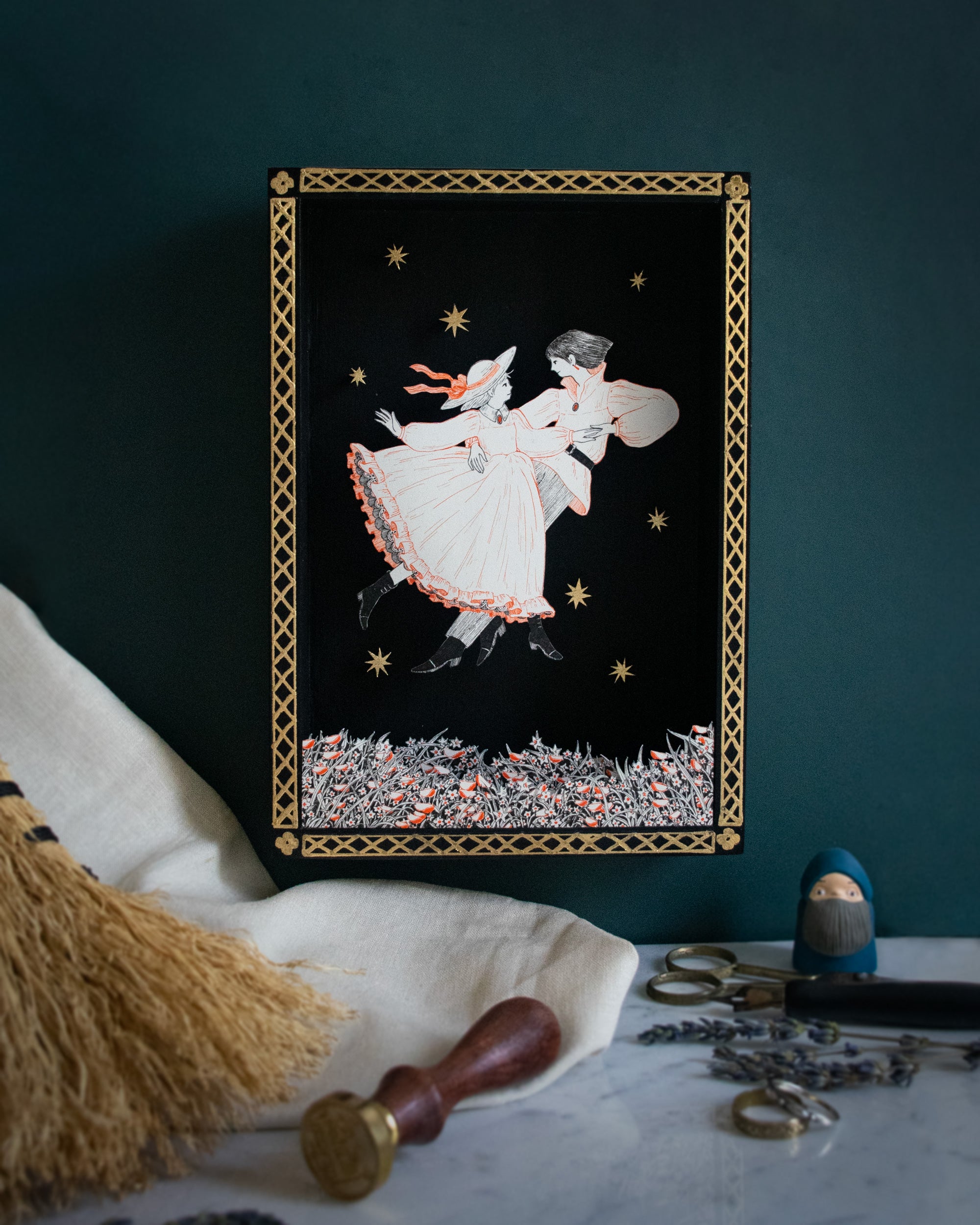 Paper cut-outs of pen and ink drawings on Arches watercolor paper, mounted on a wooden shadow box embellished with gold leaves. The piece is backed with felt and a sawtooth hook for display.