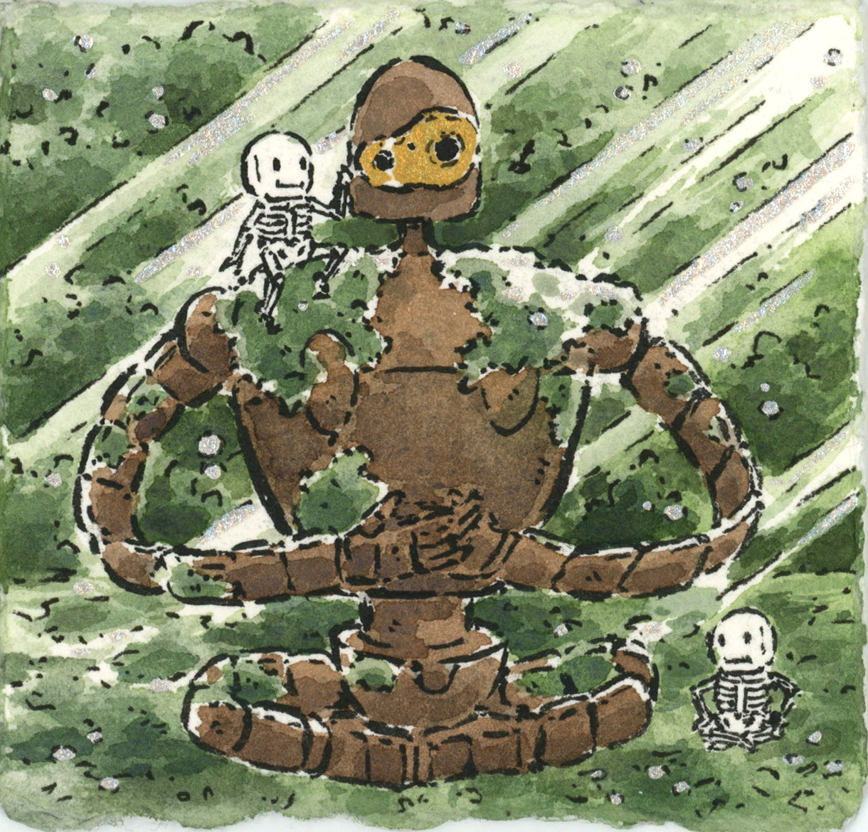 Ink, watercolor and acryla gouache. Piece is unframed.