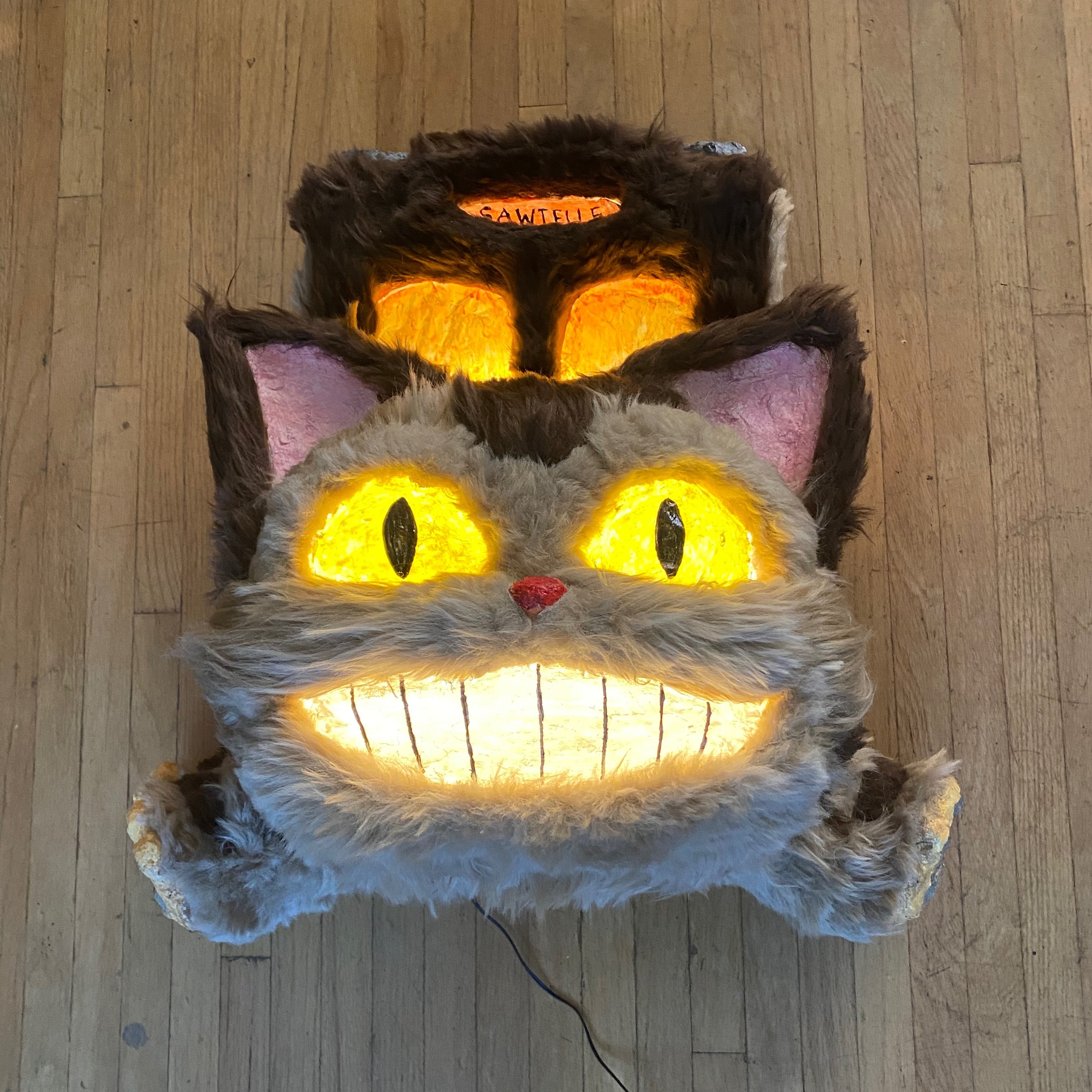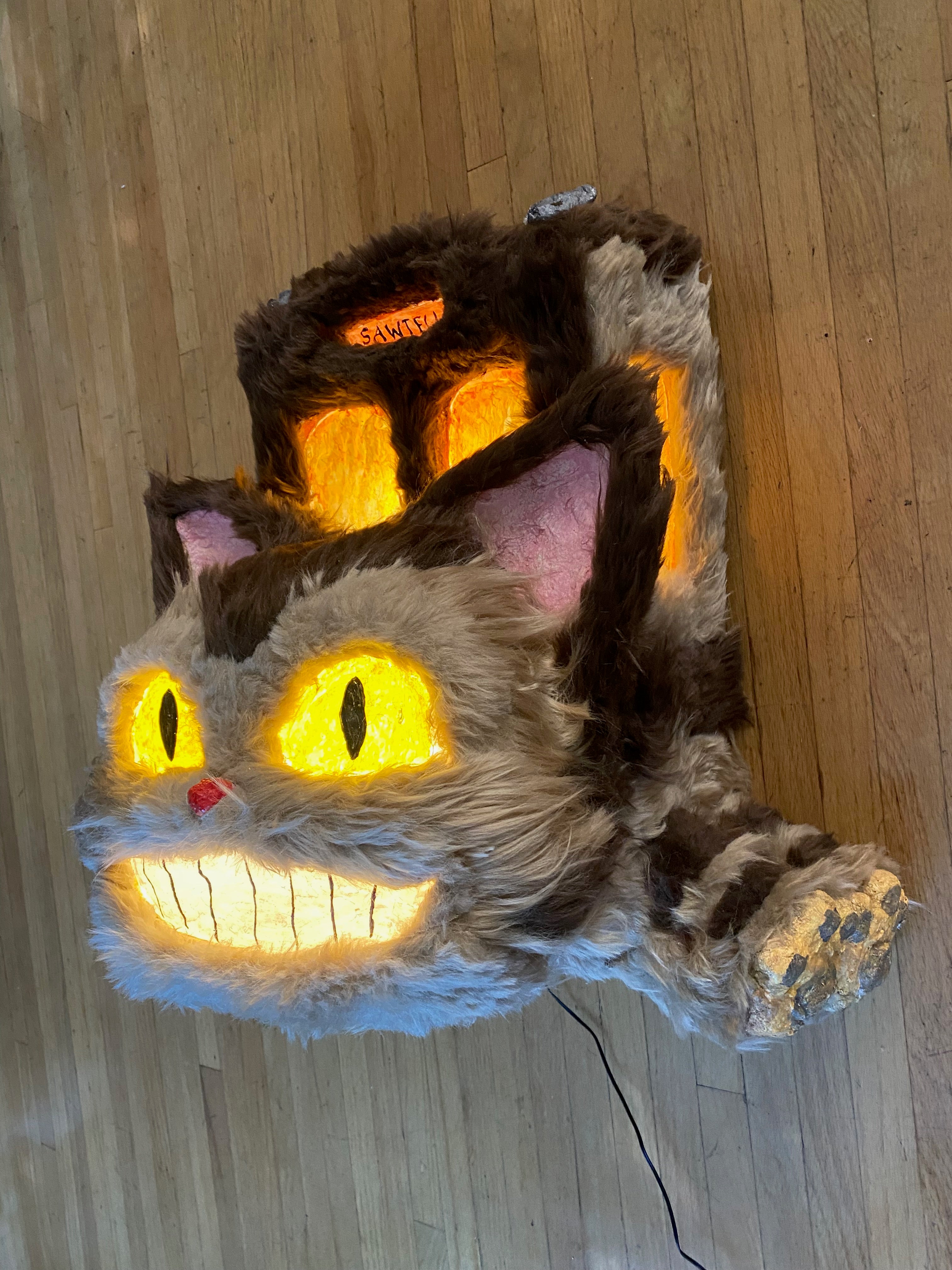 Catbus shaped paper mache and fur wall hanging sculpture, smiling and with lighting elements.