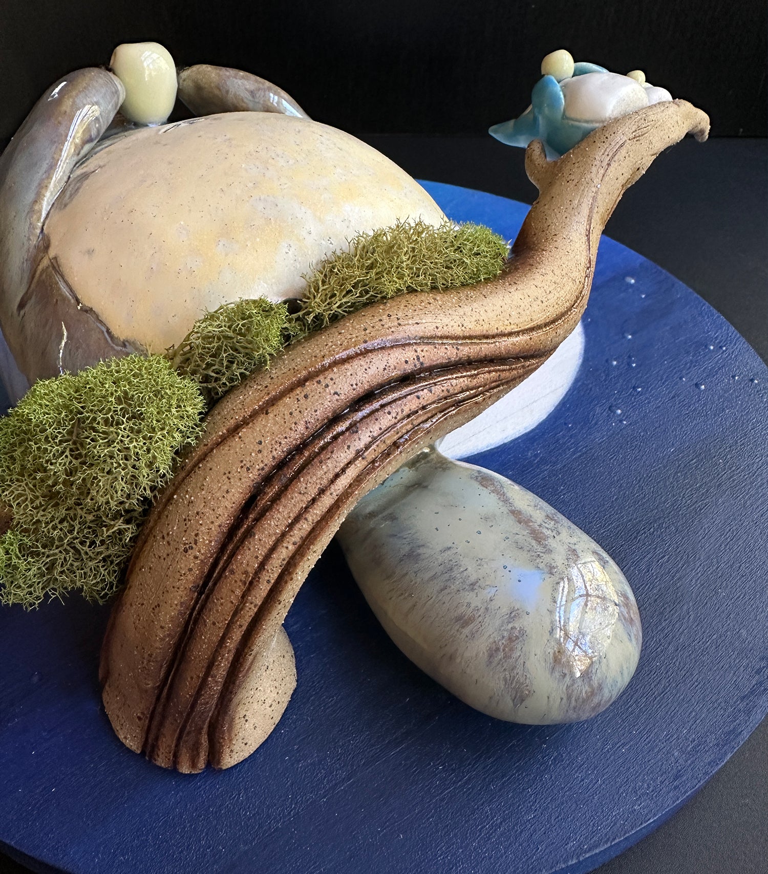 Ceramic and mixed media (Moss, glow in the dark resin, and gouache on wood board).