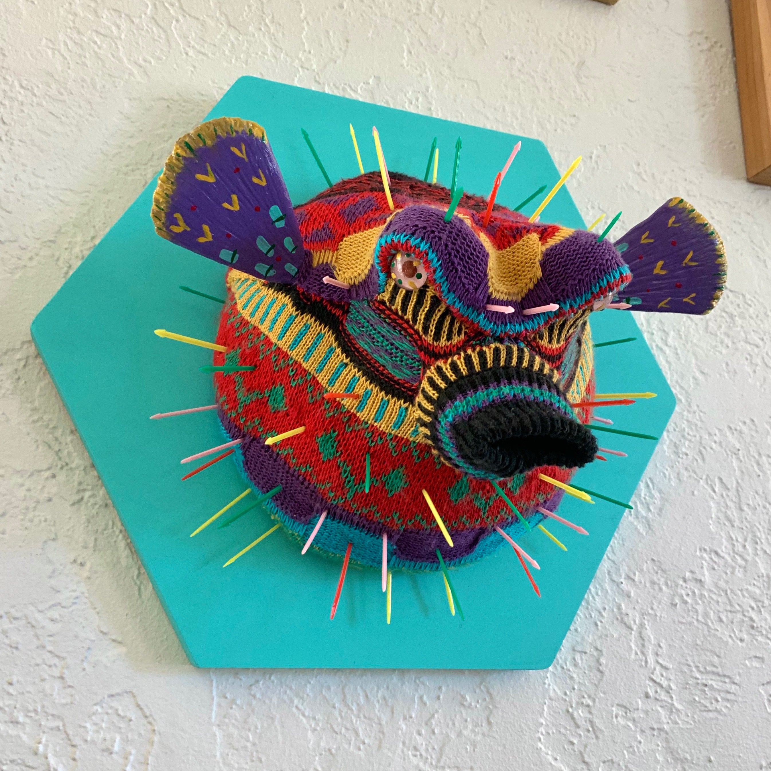 Artwork measures 12 x 14 x 8 inches. Vintage Sweater, Polymer Clay, Foam, Glass Eyes, Cocktail Picks.