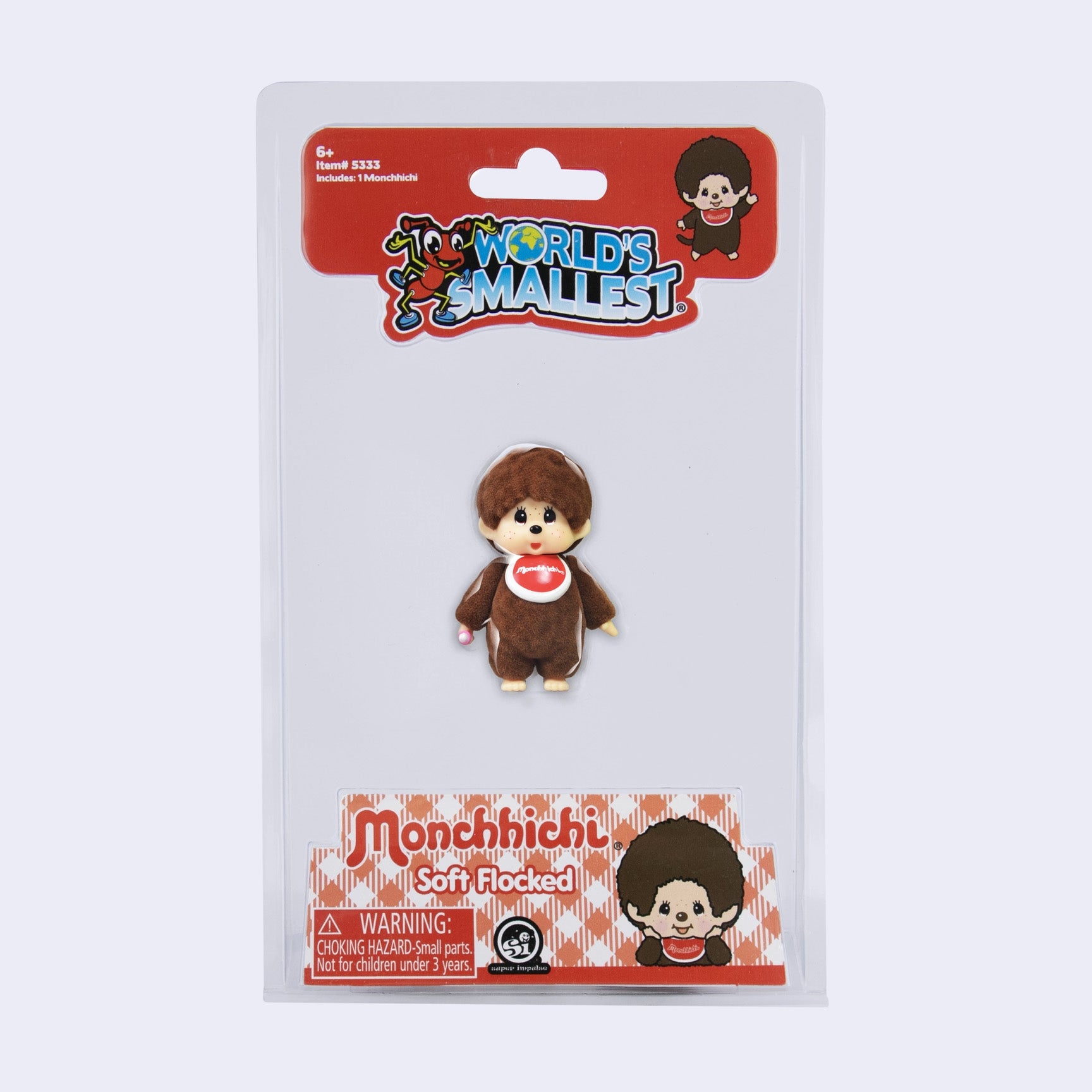Monchhichi tiny figure in clear packaging with 'World's Smallest' branding on a white background