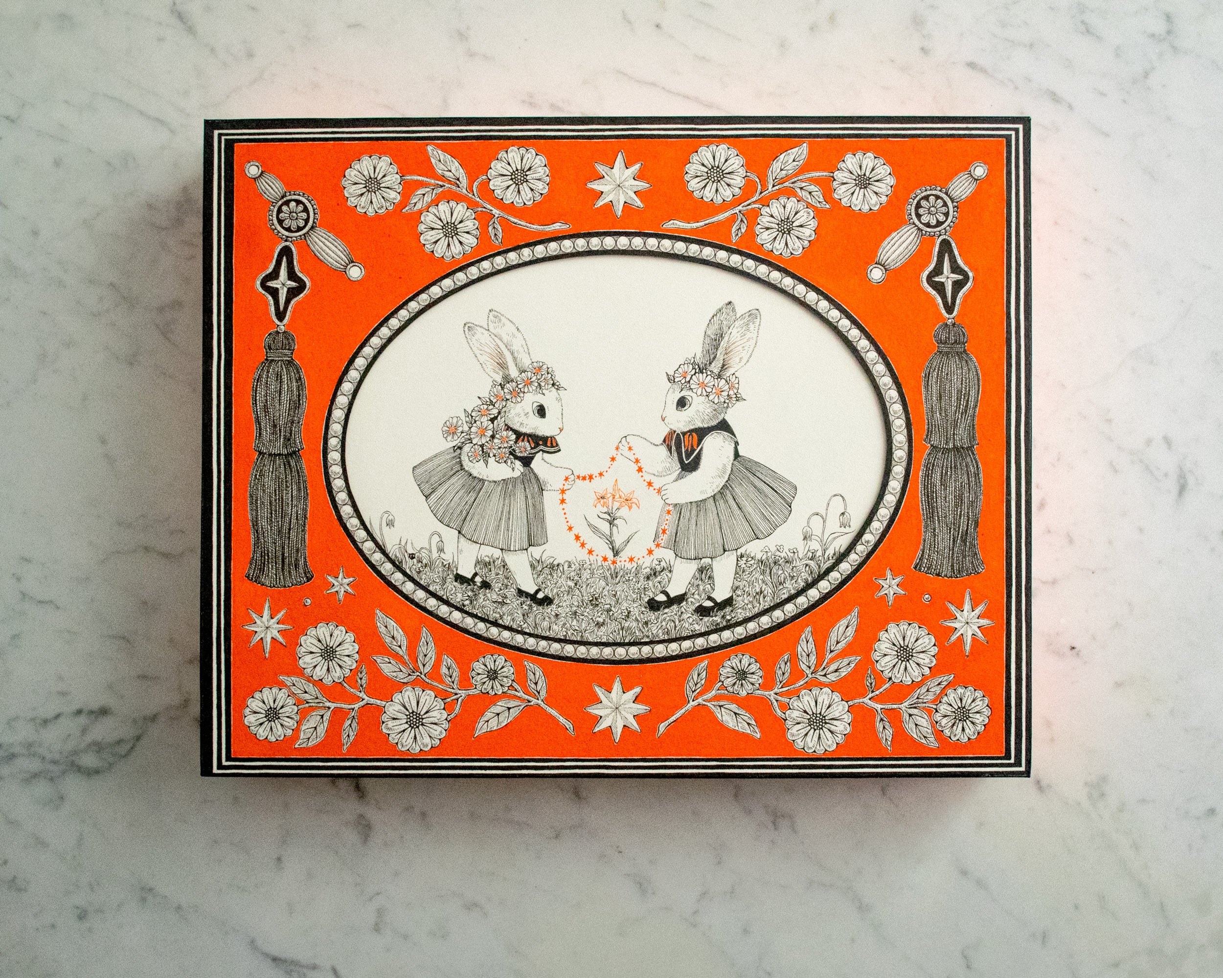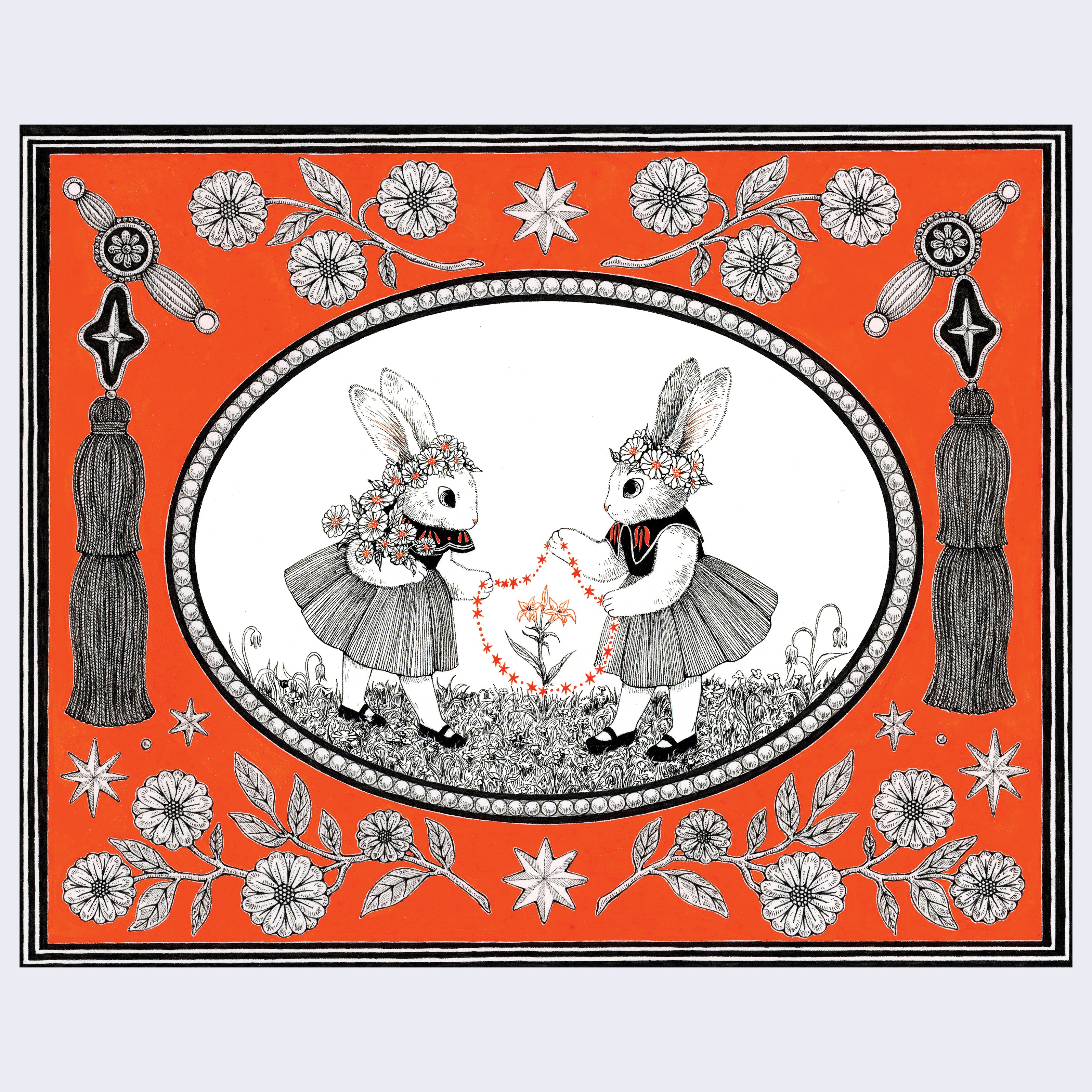 Fine line black ink illustration on bright orange panel, with the focal point encased in a decorative bordered oval in center of panel. 2 bunnies wearing dresses and flower crowns face each other and hold a connected chain of orange stars. Outside of the oval, are tassels on each side and decorative flowers on top and bottom.