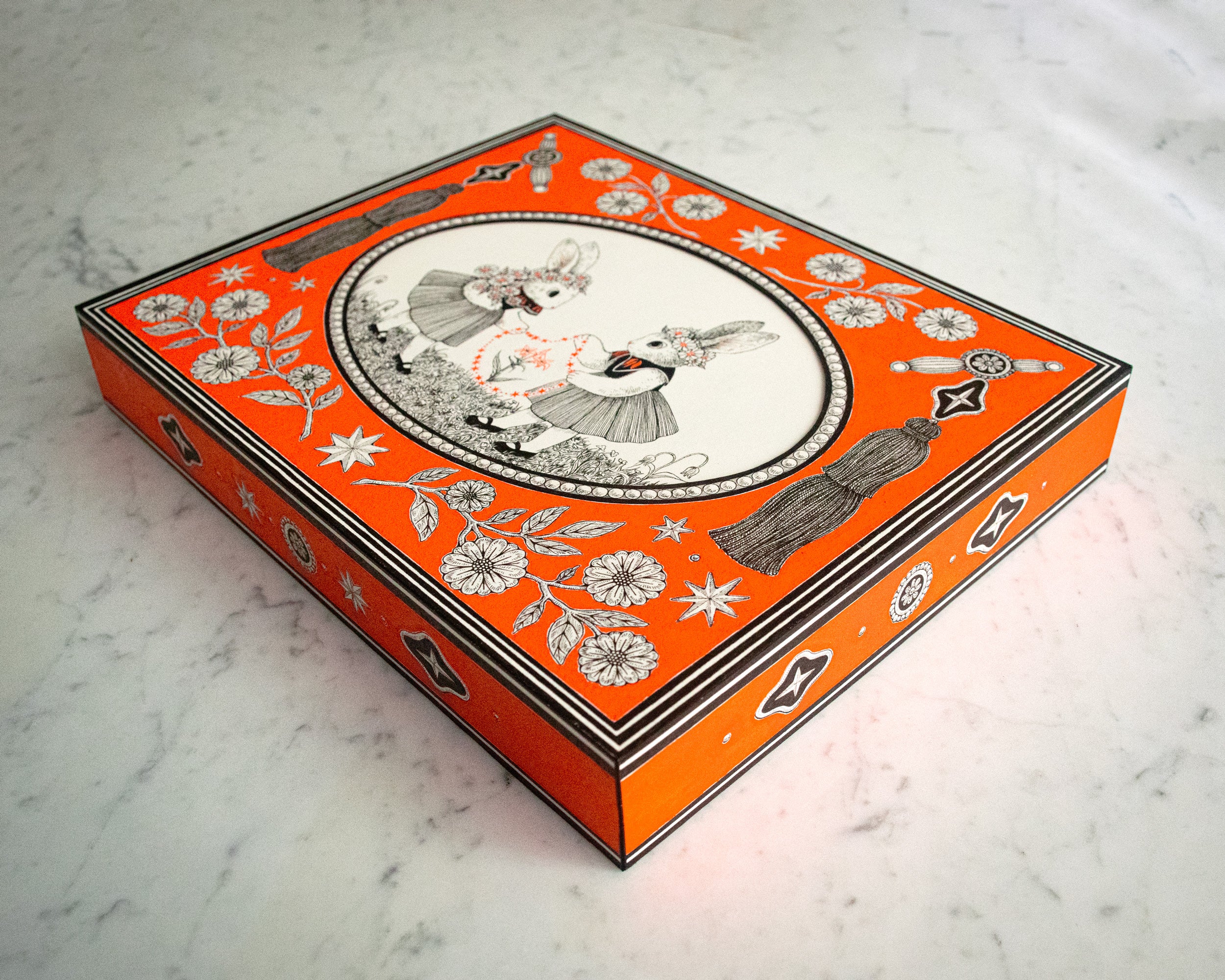 Fine line black ink illustration on bright orange panel, with the focal point encased in a decorative bordered oval in center of panel. 2 bunnies wearing dresses and flower crowns face each other and hold a connected chain of orange stars. Outside of the oval, are tassels on each side and decorative flowers on top and bottom. Sides of the panel are painted with patterns.