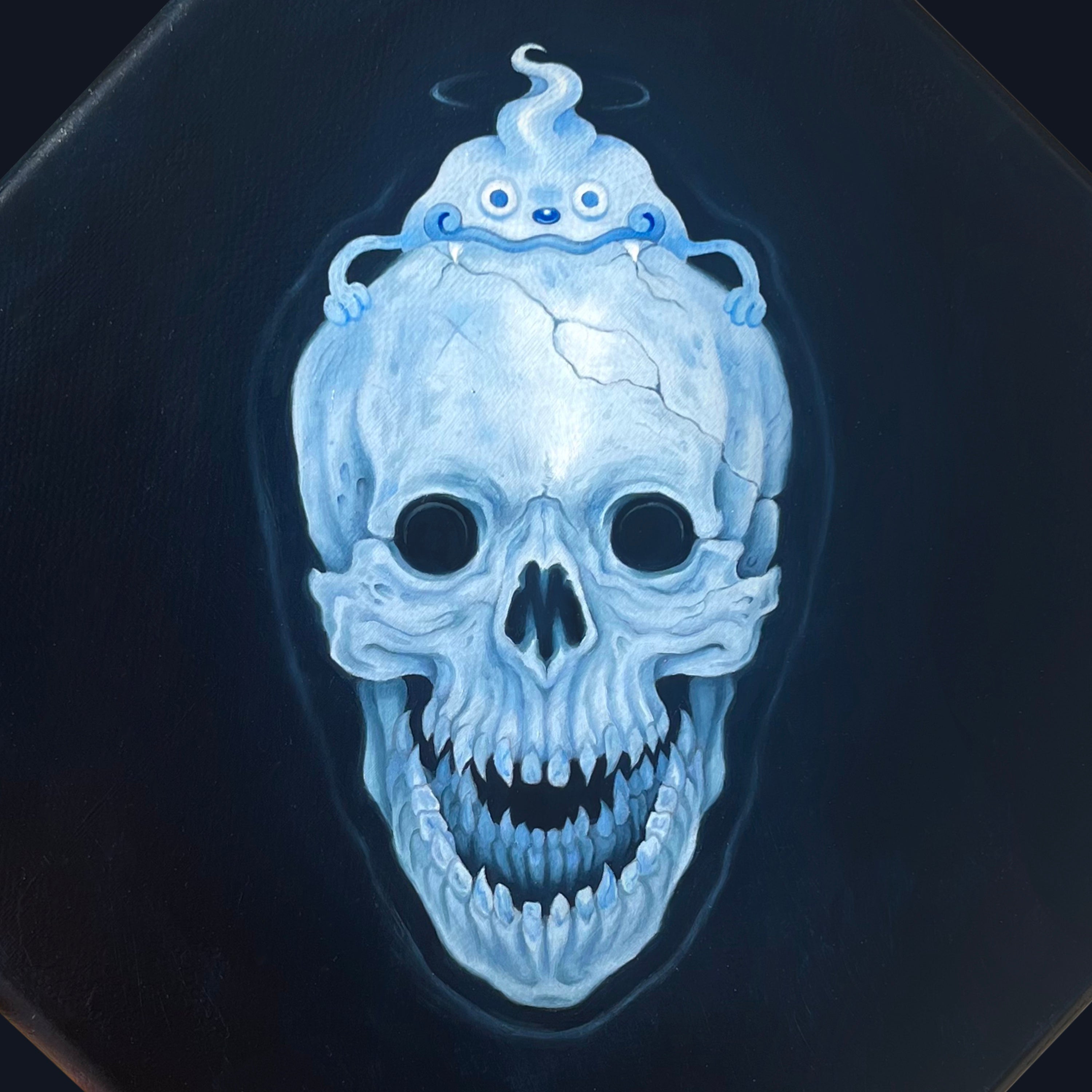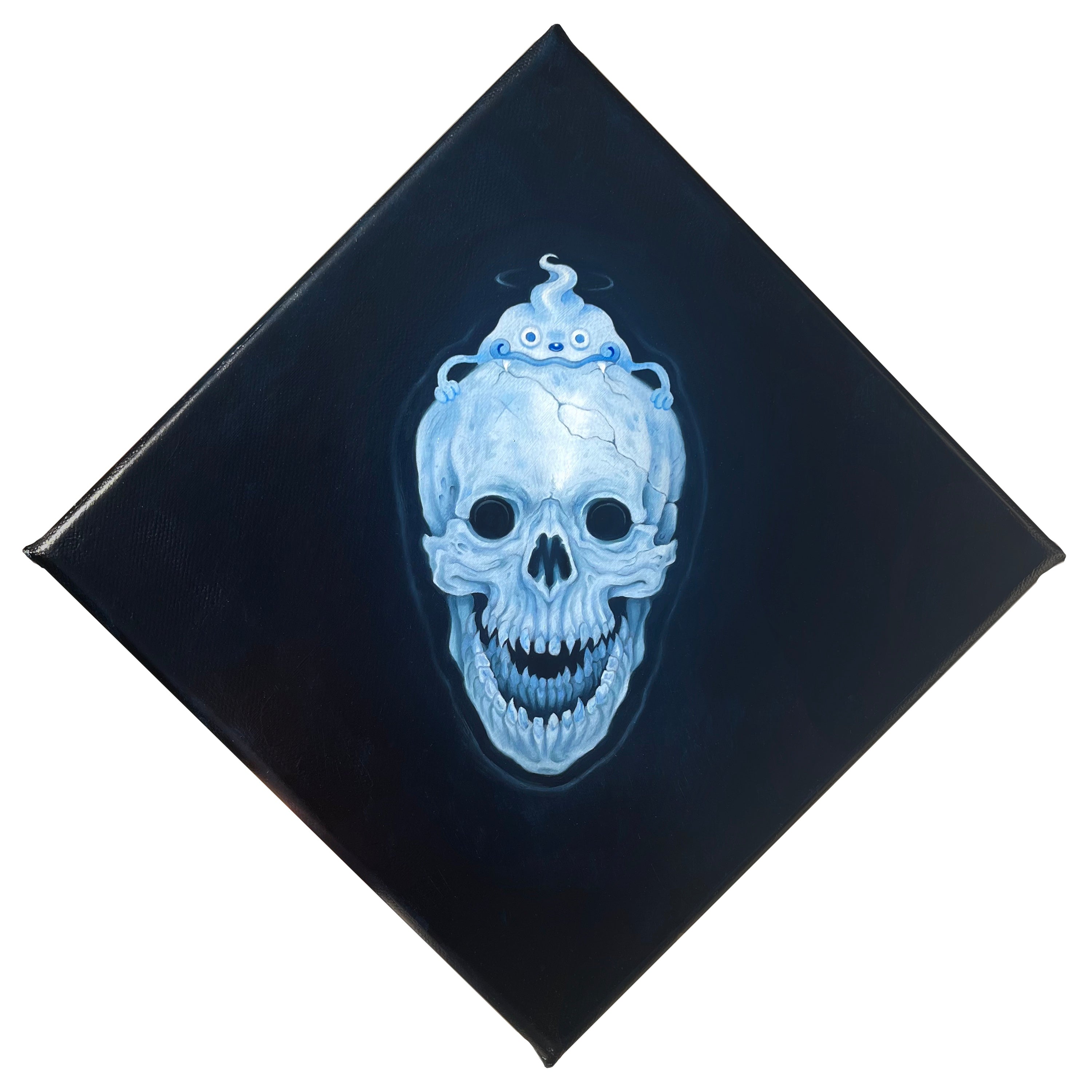 Dark blue, almost black, canvas with a painting of a skull with Whisper from Yokai Watch positioned cutely on top of the skull. Close up to show detail.