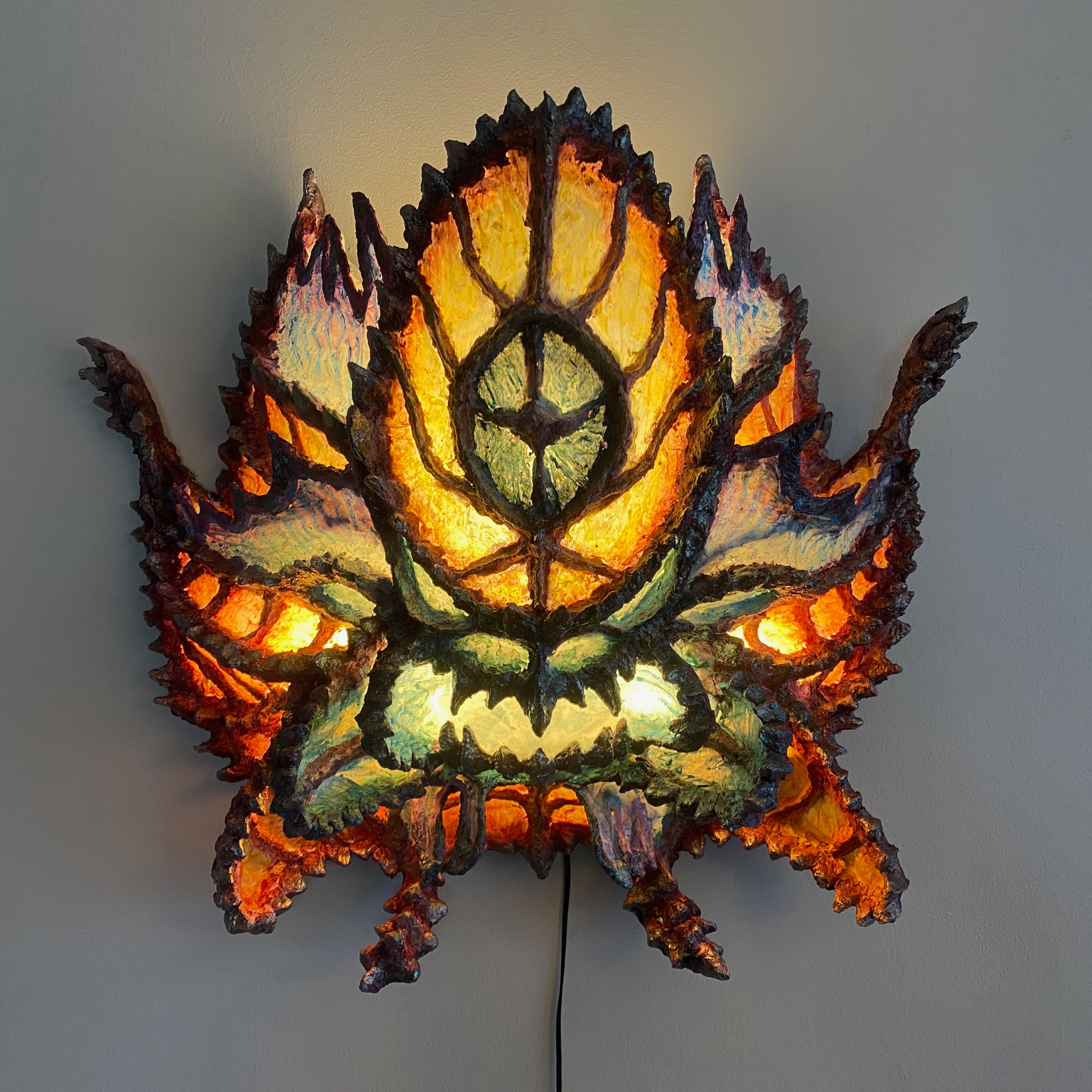 Paper mache, wire, glassine paper, acrylic paint and lights.