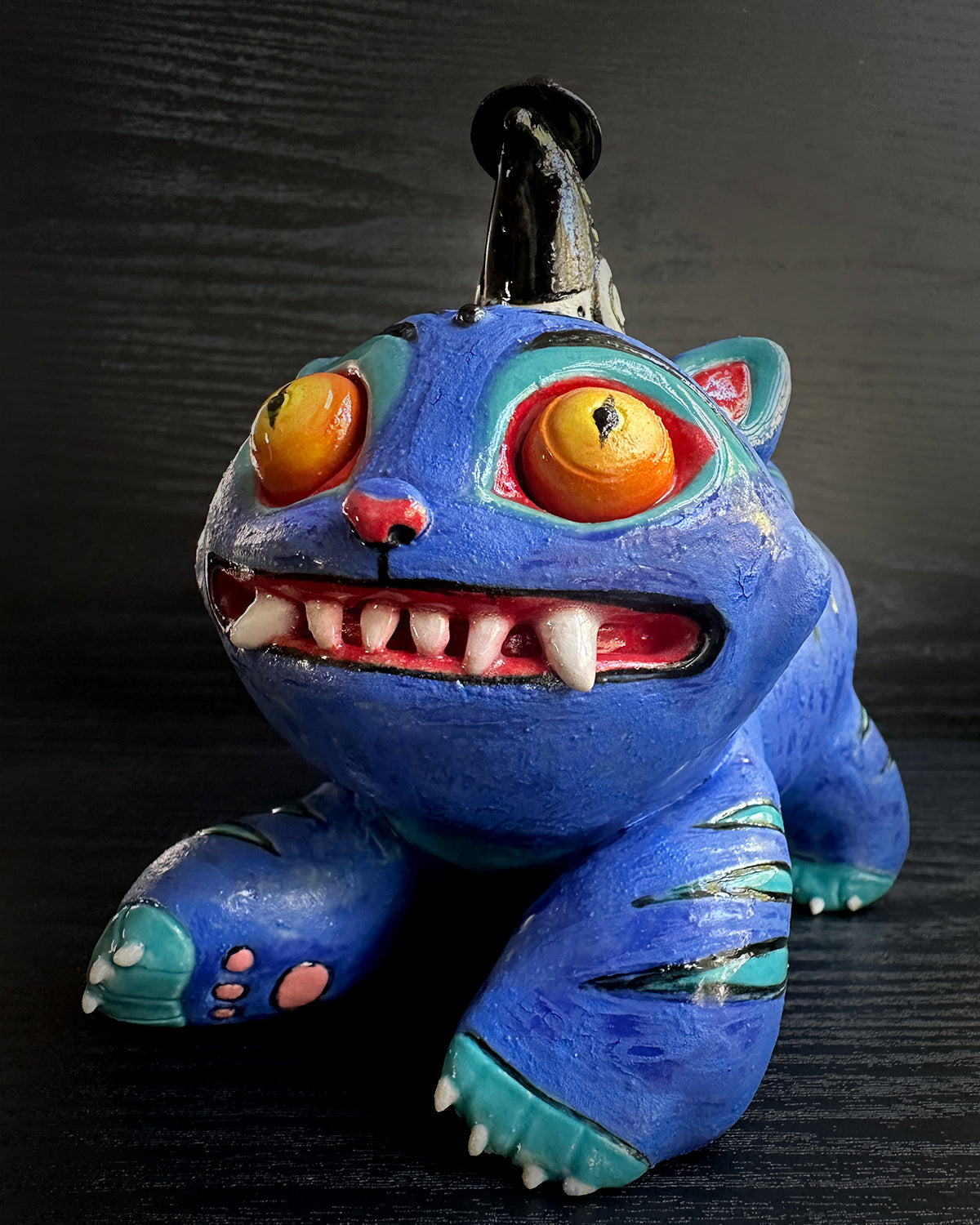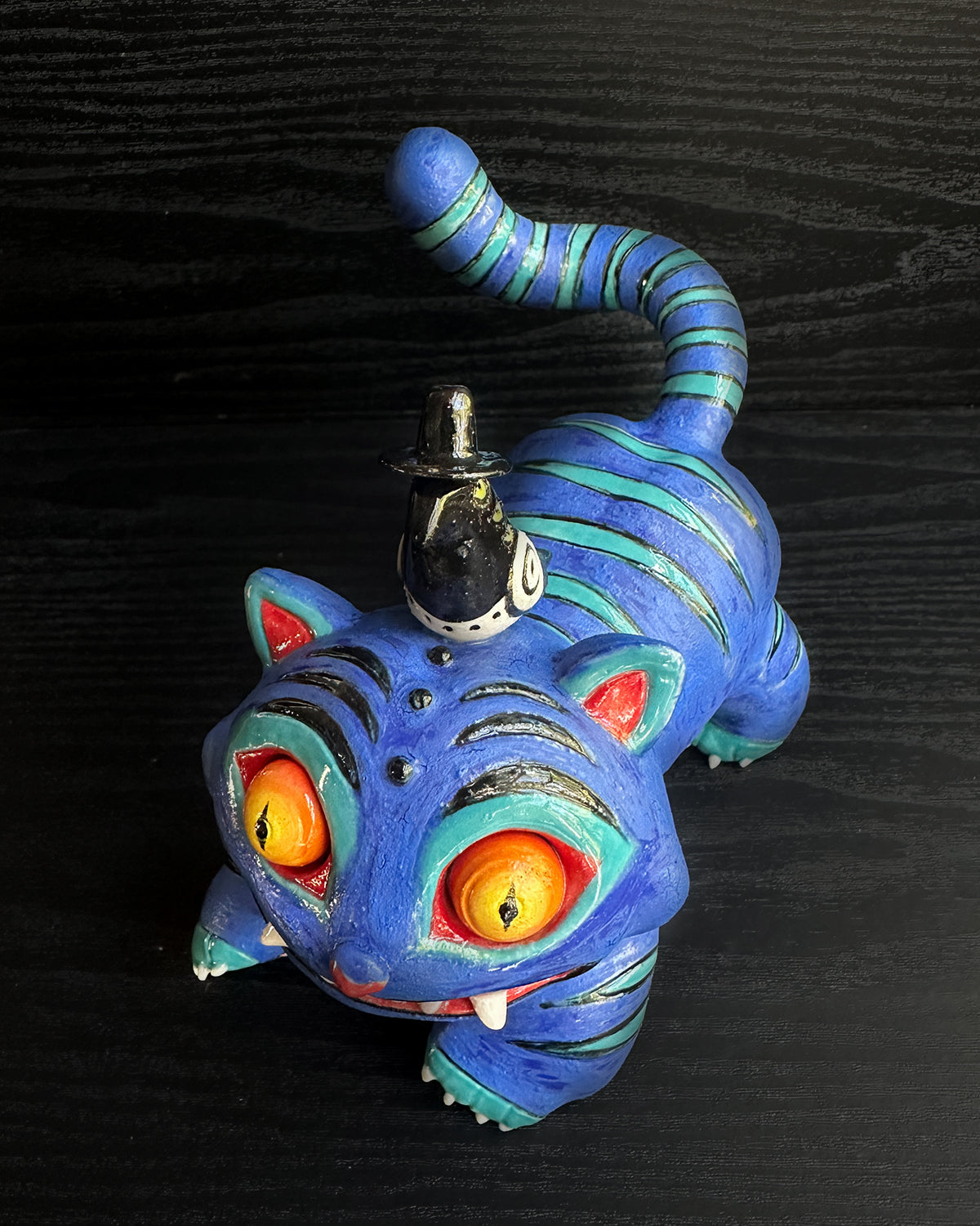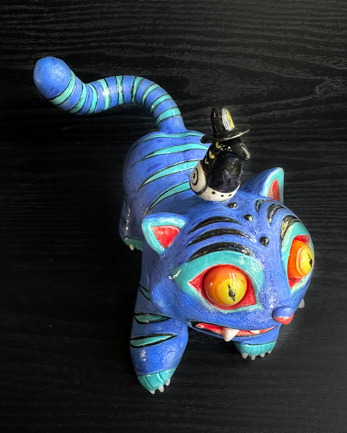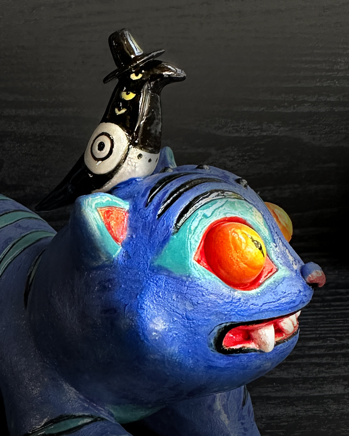 Colorful figurine of a blue cat with a small bird figure on its back against a black background