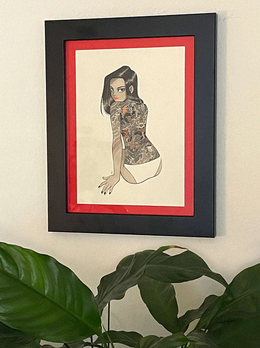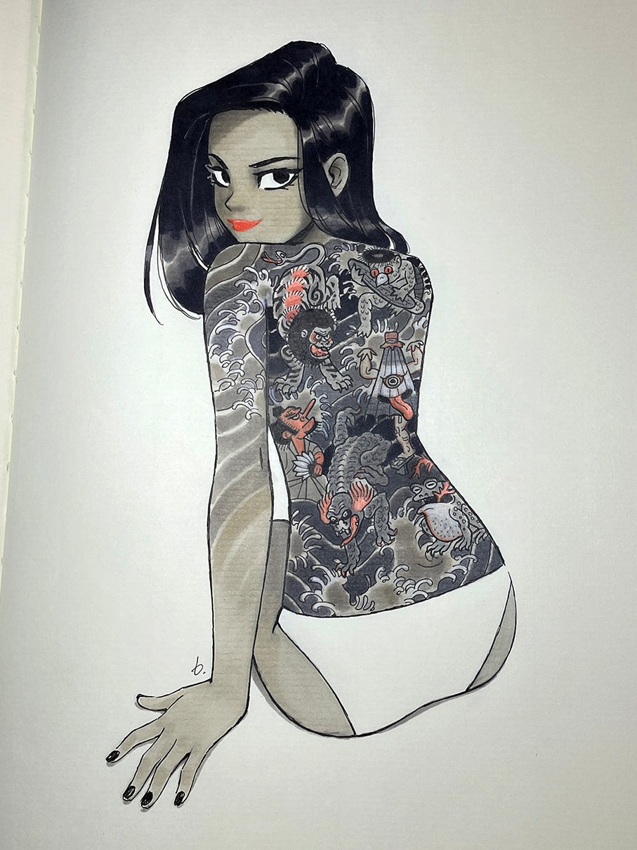 Illustration on solid white background of a woman, sitting on the ground in only white underwear, looking back at the viewer. Her back is covered entirely with traditional Japanese art style tattoos. Shown with pens and pencils on a workspace.