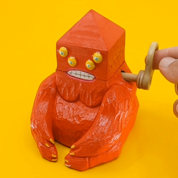 Gif of a wooden sculpture, a red demon with a triangular head and 4 yellow eyes. Its mouth opens and closes as a lever is turned.