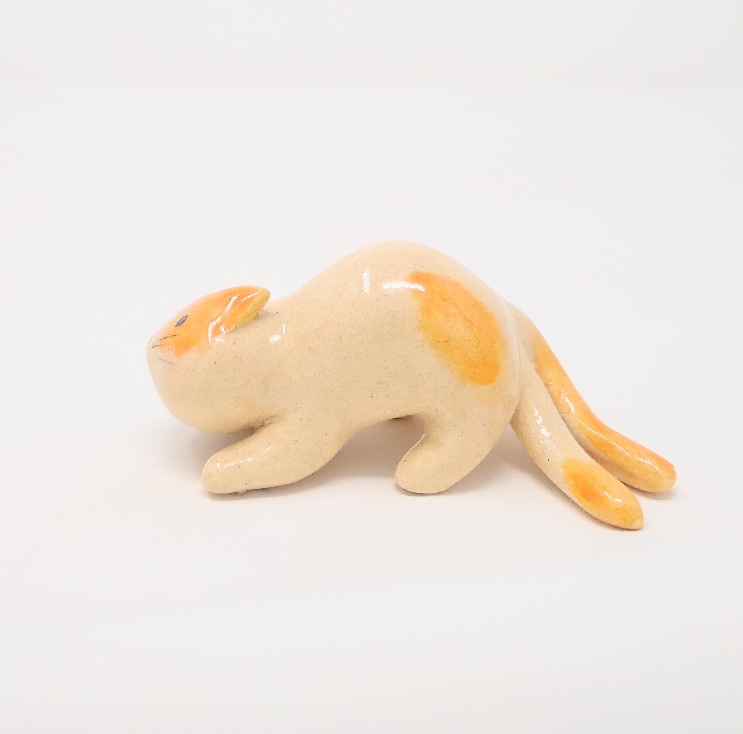 Ceramic sculpture of cream colored with orange spots cat on all fours, leaning with its head tilted as though ready to be petted. It has 2 tails.