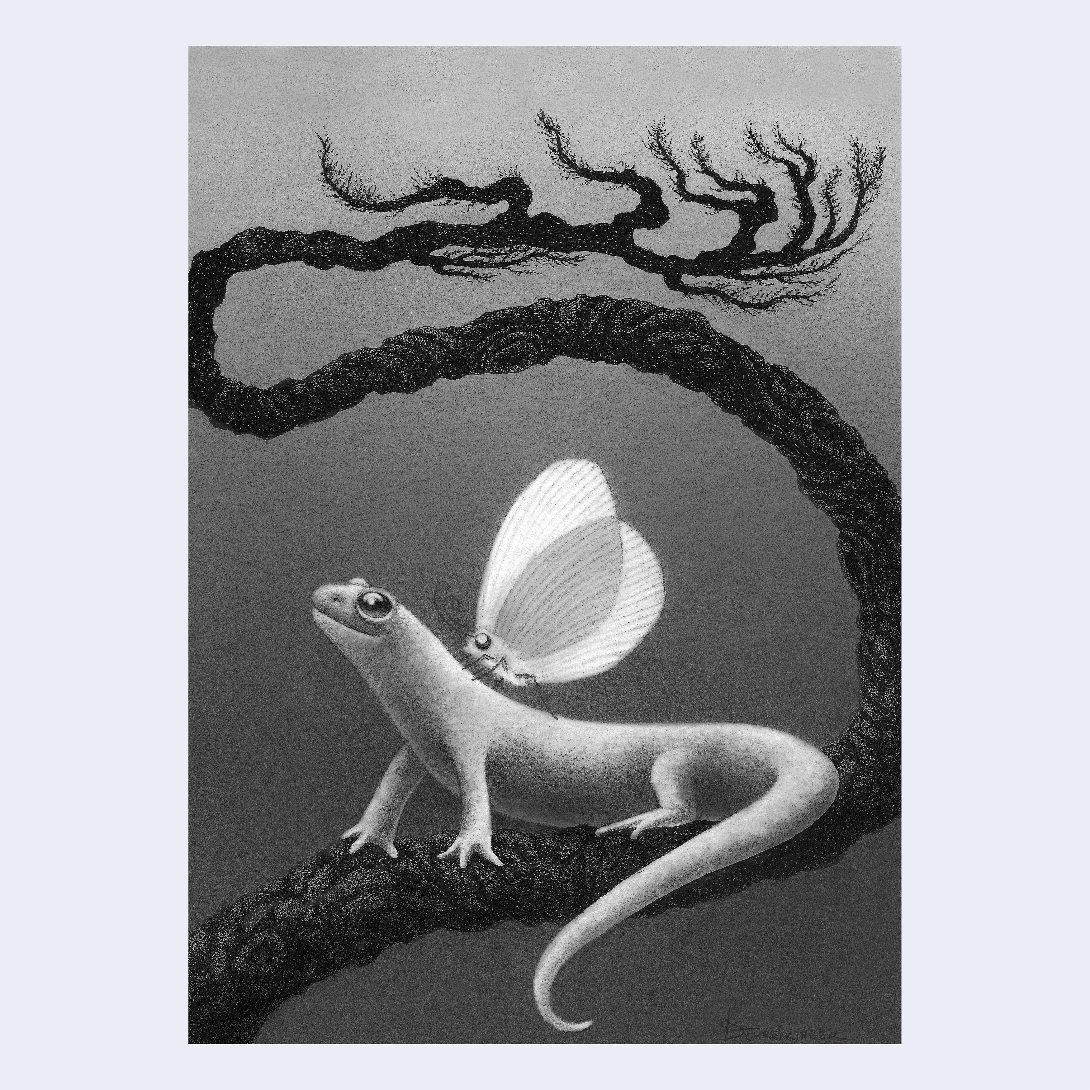 Finely rendered graphite illustration of a small gecko on a a braided thin tree branch, that branches off further behind it. Atop the gecko's back is a white moth.